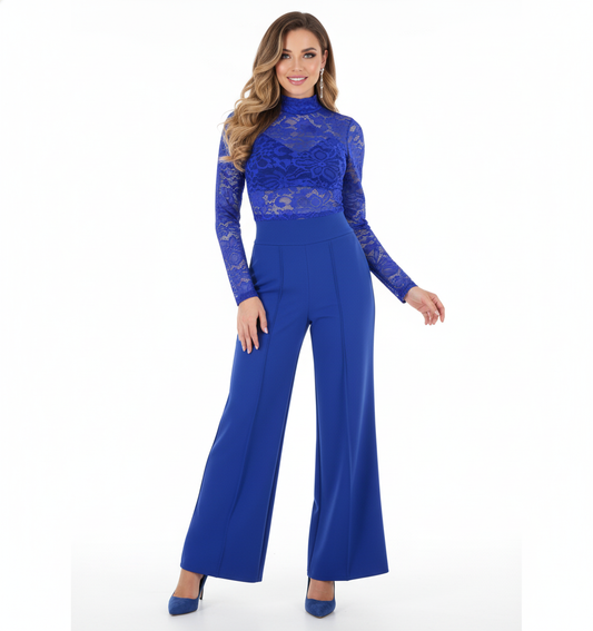 Conjunto pantalón y blusa de encaje que estiliza con delicadeza estructurada