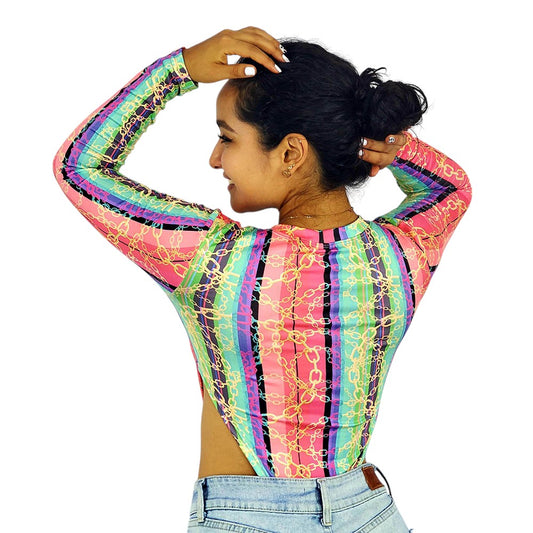 Pantyblusa brasileña de rayas multicolor con cadenas doradas y espalda descubierta
