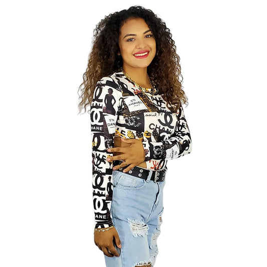 Pantyblusa brasileña estampada de impacto gráfico con manga larga y ajuste slim