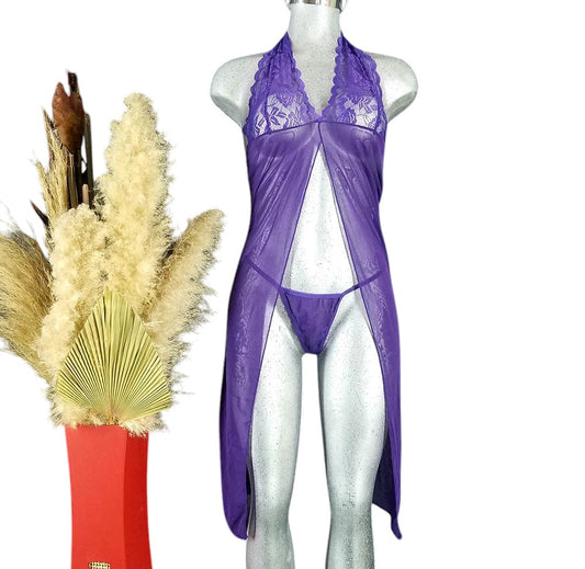 Babydoll largo con encaje floral y abertura lateral estilo negligé provocador