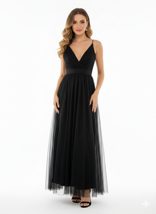 Vestido largo con escote corazón y caída de tul que realza tu elegancia