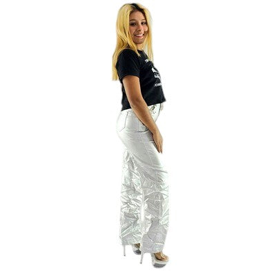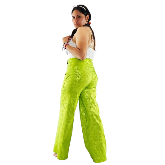 Pantalón acampanado con textura brillante que estiliza con movimiento