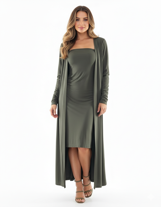 Conjunto acampanado de tres piezas con brillo sutil que estiliza tu silueta