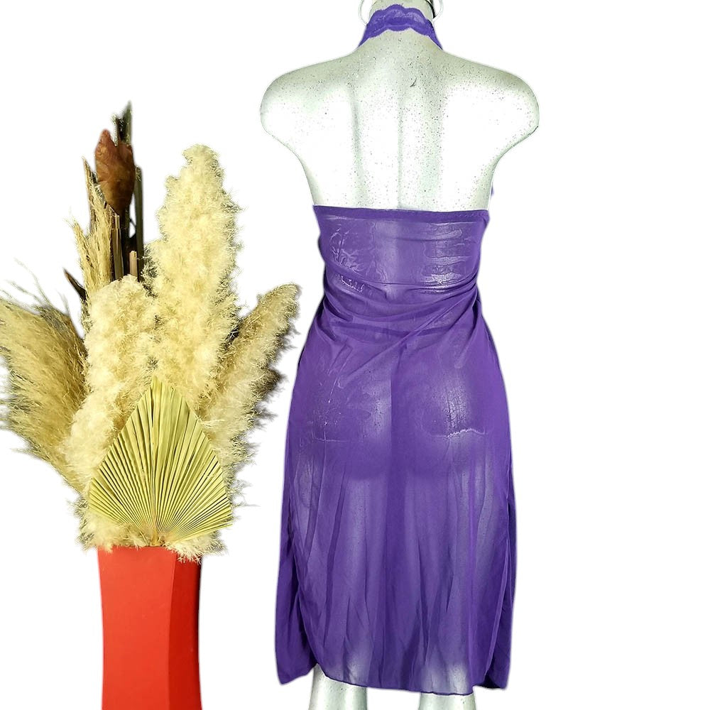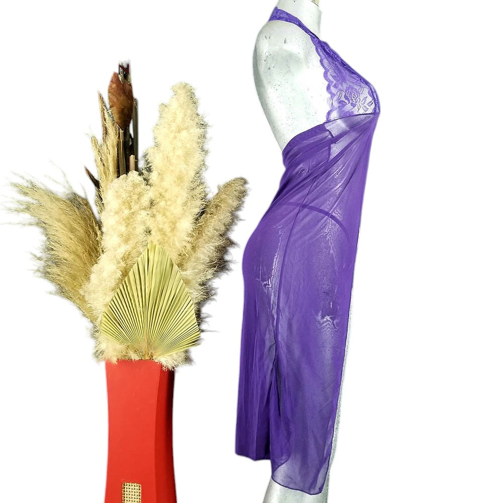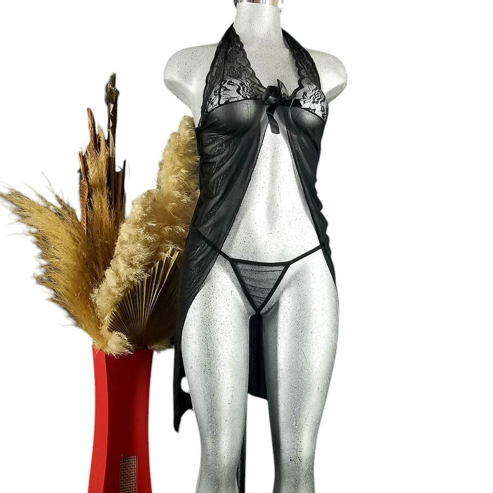 Este babydoll largo es una invitación visual al deseo. El busto en encaje floral con escote halter enmarca el pecho con suavidad romántica, mientras la abertura central en caída ligera deja ver la silueta con sensualidad elegante. El diseño tipo negligé logra equilibrio entre lo etéreo y lo provocador. Perfecto para noches que no se planean, pero se recuerdan.