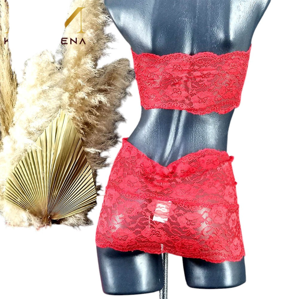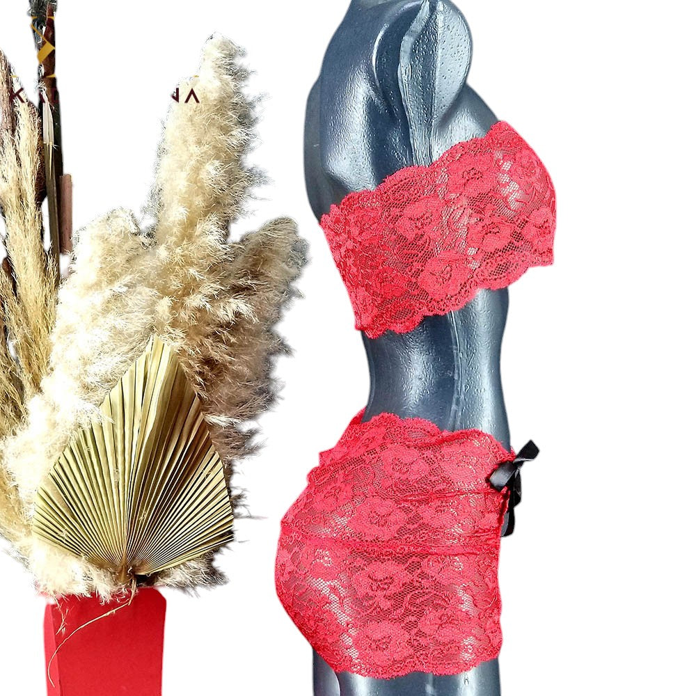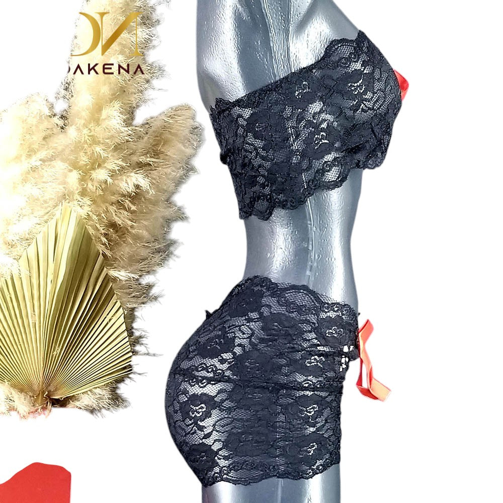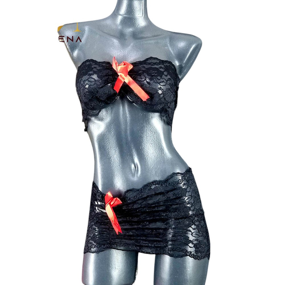 Este conjunto de lencería combina la suavidad del encaje floral con un diseño coqueto y atractivo. El top tipo banda sin tirantes y la falda corta de encaje transparente, decorados con moños contrastantes, evocan un aire travieso y delicado al mismo tiempo. Ideal para sentirte femenina, segura y encantadora, este conjunto realza tus curvas con un equilibrio perfecto entre insinuación y ternura.