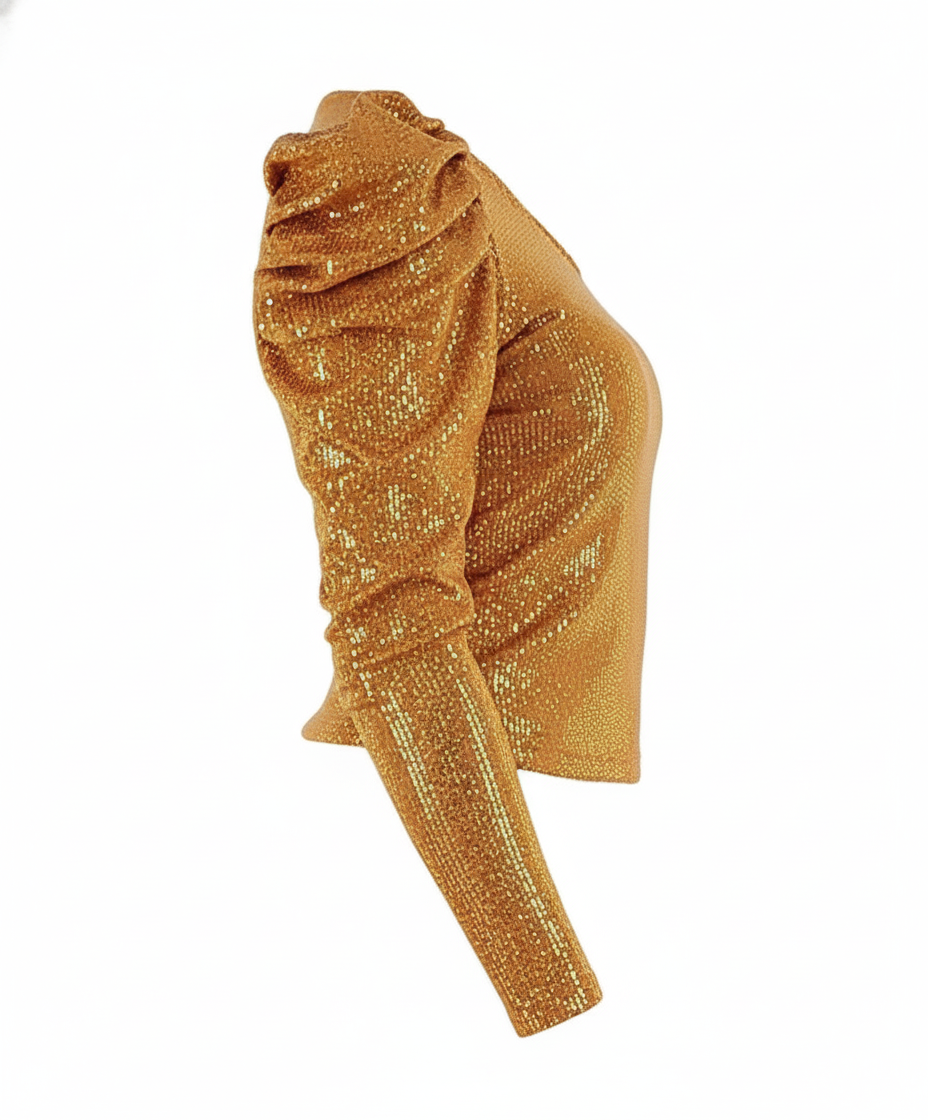 Esta blusa corta de una sola manga con volumen y escote asimétrico irradia personalidad audaz y moderna. Su tejido brillante se ajusta delicadamente al cuerpo, acentuando la silueta con elegancia y actitud. Ideal para brillar con confianza en cualquier evento social nocturno.