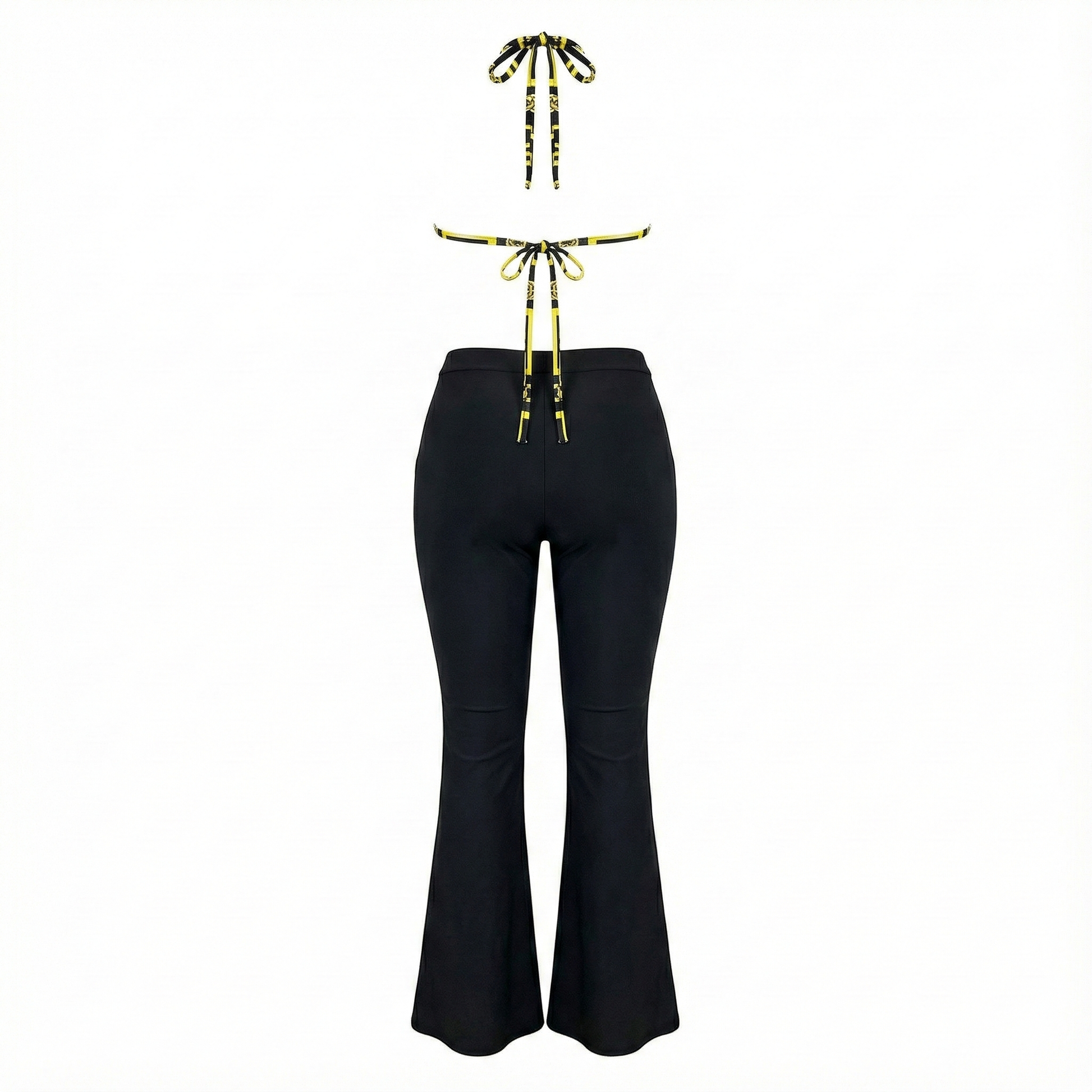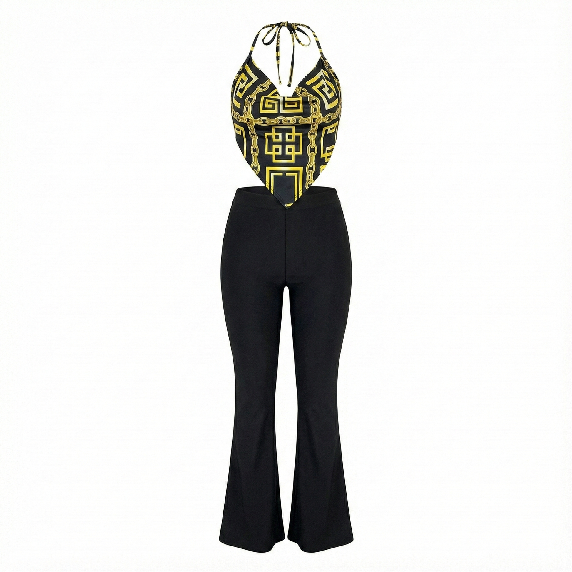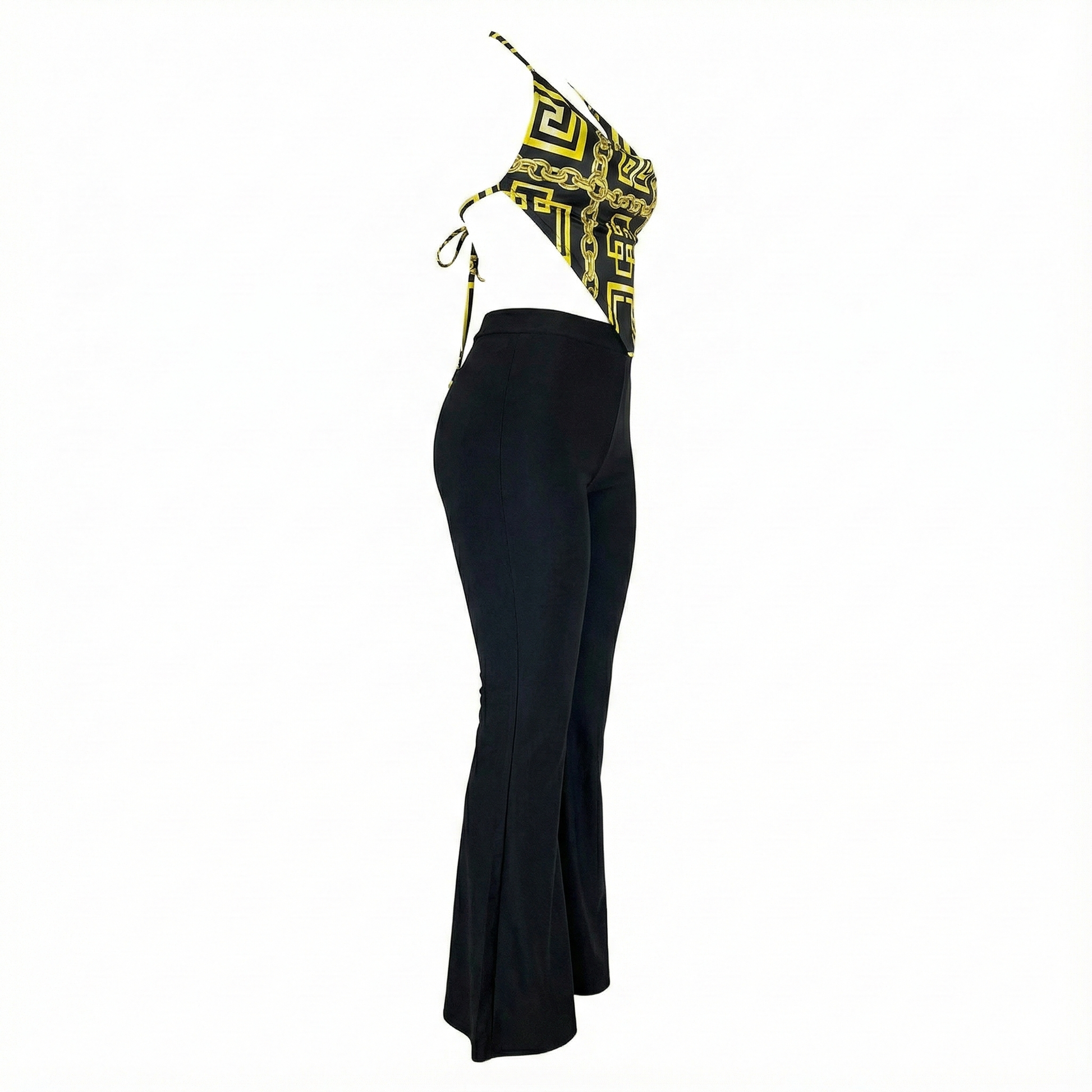 Este conjunto combina una blusa tipo crop con corte diamante y amarre en la espalda con un pantalón acampanado de silueta esbelta. Los detalles visibles en costura y su estructura estilizada evocan seguridad femenina, sensualidad medida y un estilo con carácter. Ideal para quienes desean destacar con elegancia moderna y toques de poder visual.