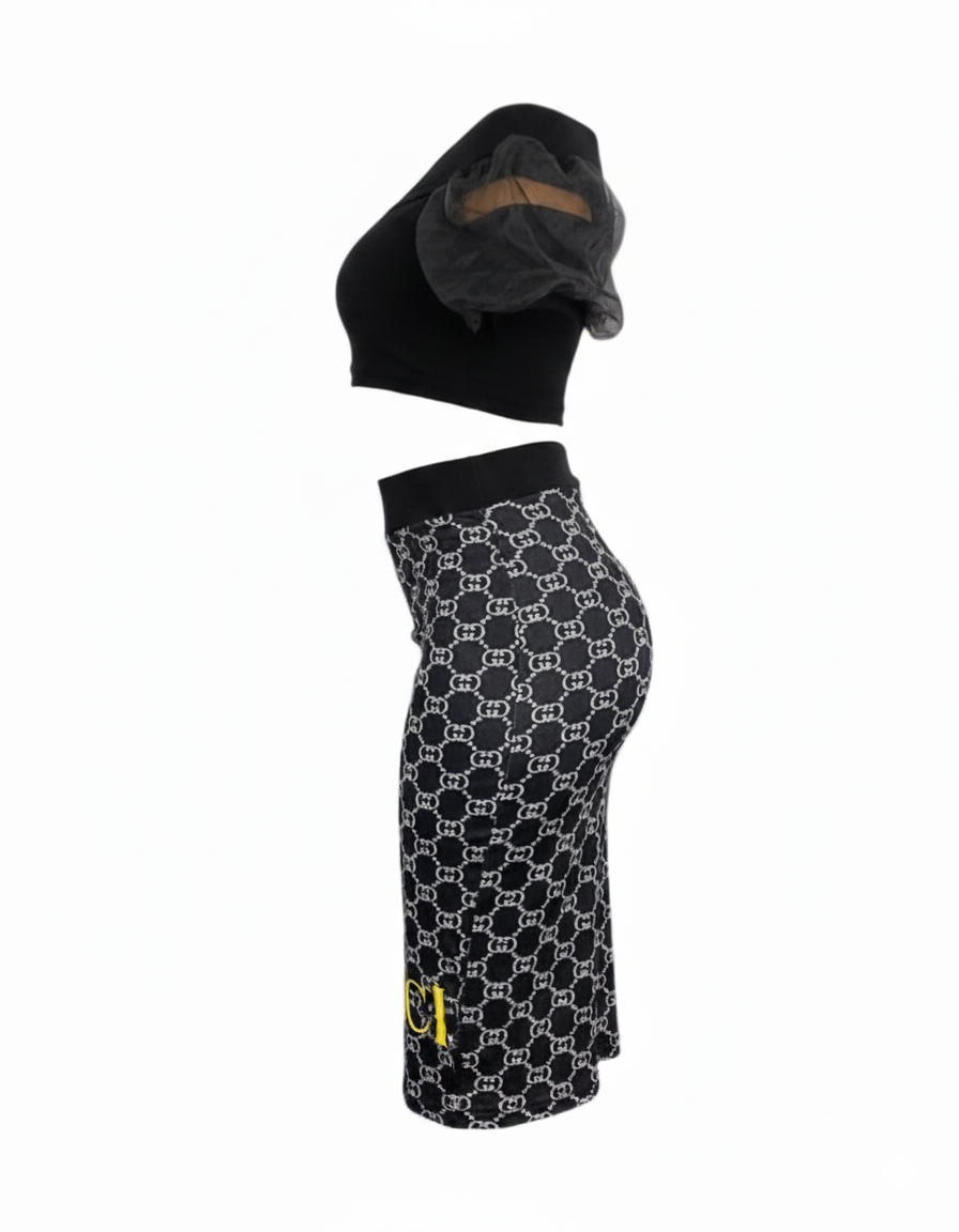 Este conjunto combina una falda tipo tubo tres cuartos con estampado caricaturesco y una blusa de hombros descubiertos con mangas tipo princesa que equilibran lo sensual y lo alegre. Ideal para mujeres que buscan proyectar una imagen desenfadada y creativa, sin perder estructura ni estilo. La silueta favorece visualmente y su diseño lúdico saca sonrisas y miradas por igual.