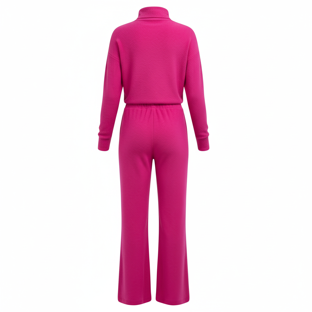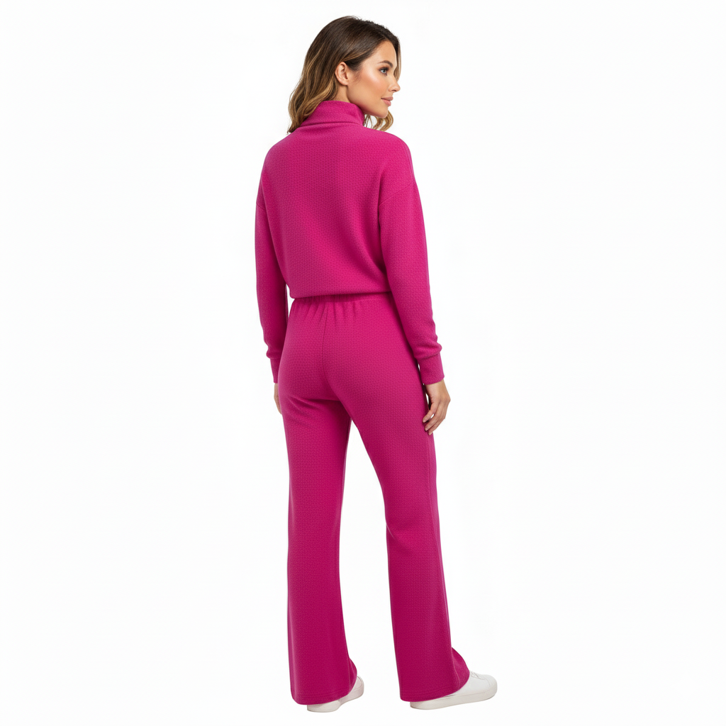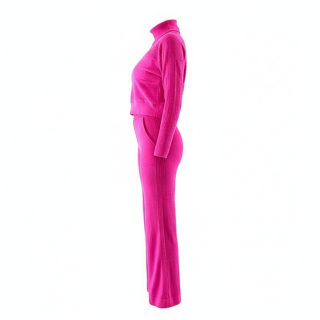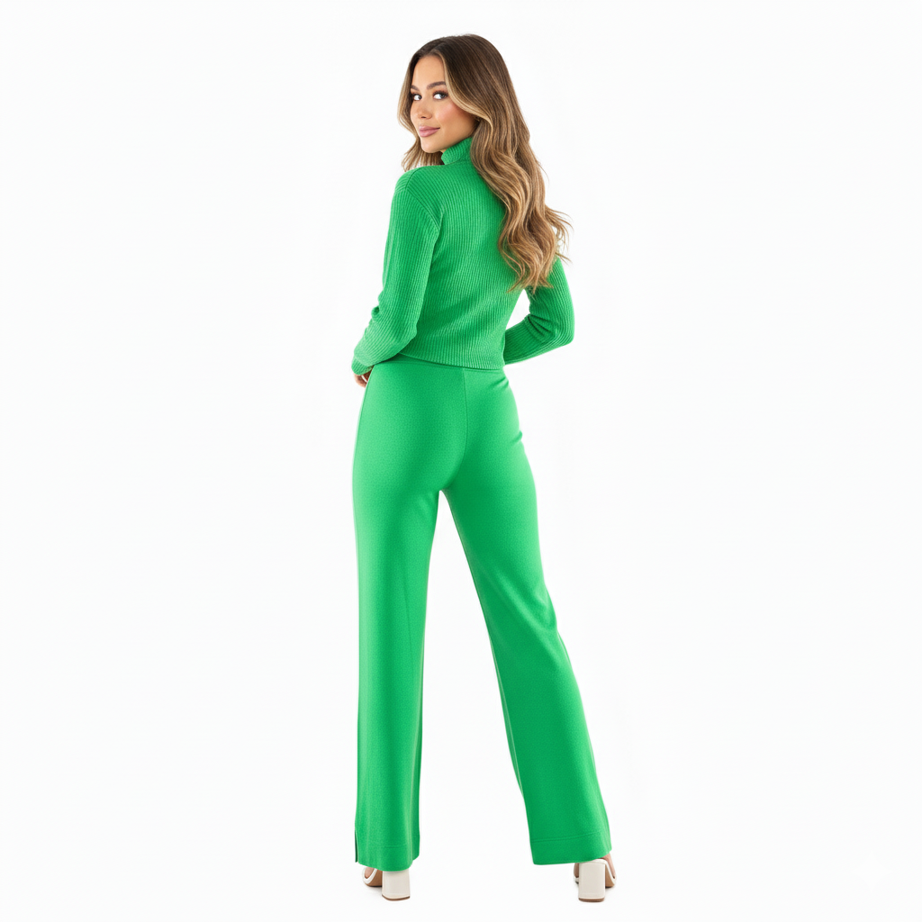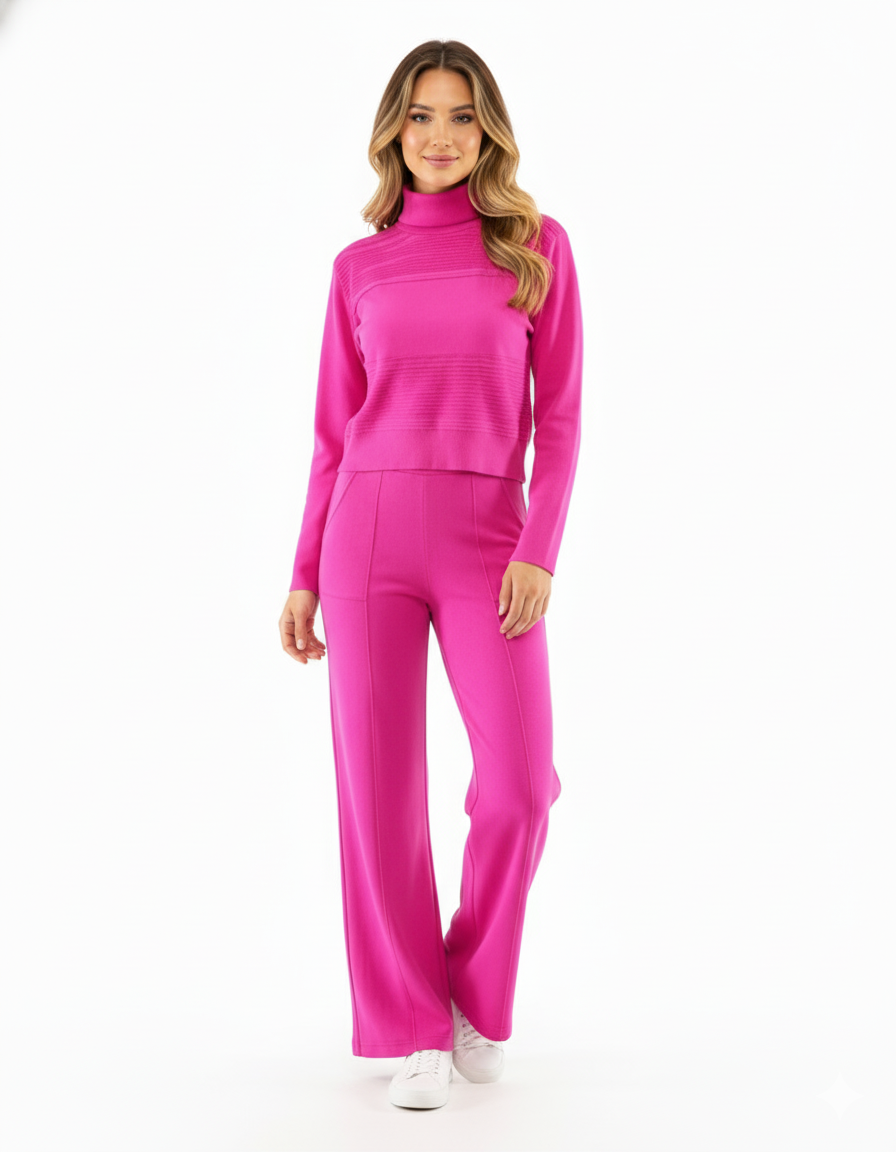 Este conjunto de dos piezas combina un pantalón recto con una blusa de manga larga y cuello tortuga, decorada con tejido sutil al frente. Su corte regular y caída fluida permiten libertad de movimiento sin perder estructura visual. Ideal para quienes buscan comodidad con intención estética, proyectando seguridad relajada y estilo natural.