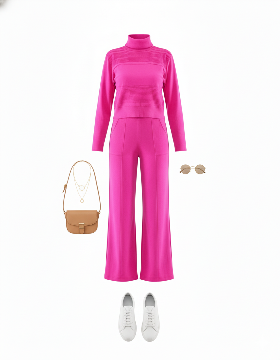 Favorece a cuerpos tipo Rectángulo, Triángulo y Óvalo, con estaturas Mediana y Alta. El pantalón recto alarga visualmente las piernas y la blusa con cuello tortuga estiliza el cuello y el busto con discreción refinada.