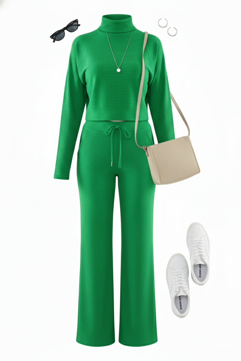 Conjunto cómodo con cuello tortuga que estiliza con textura sutil y corte relajado