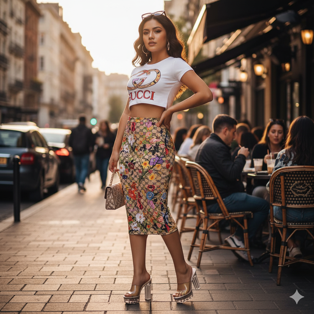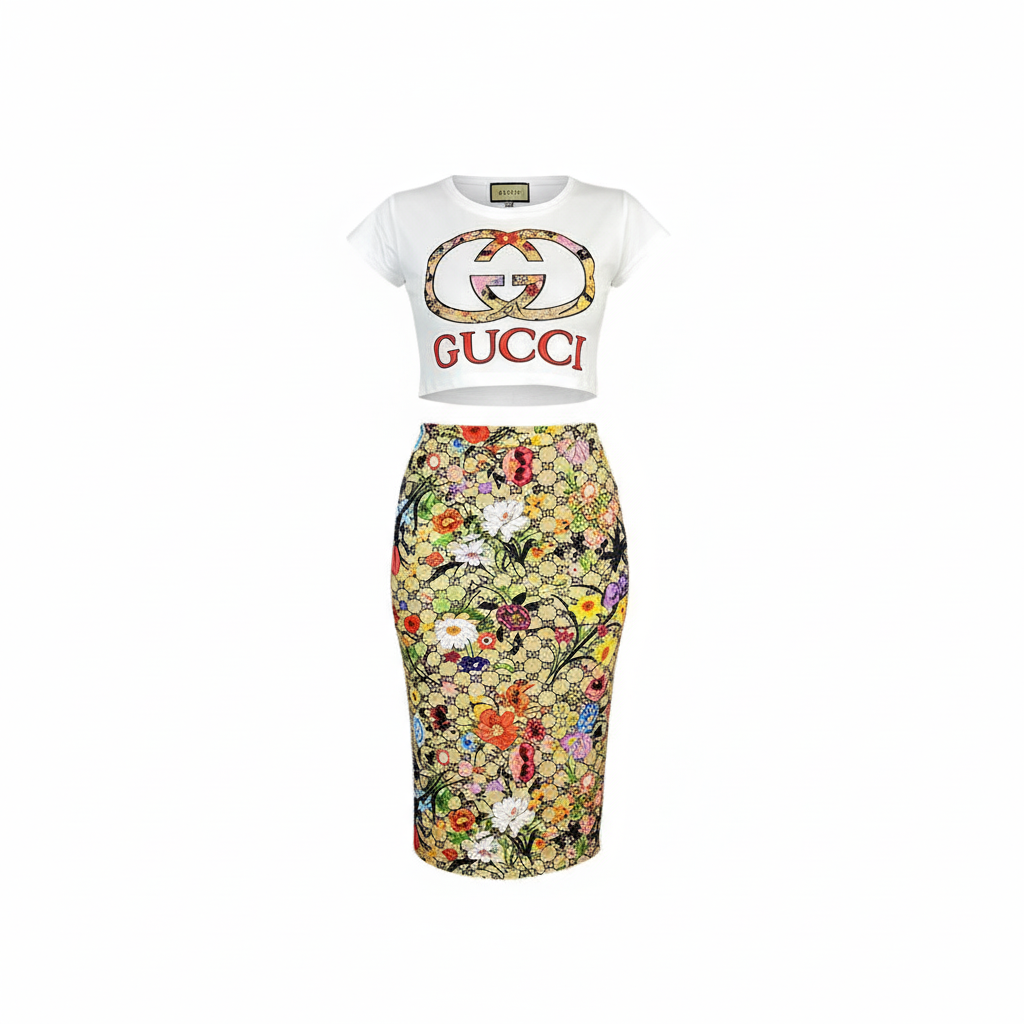 Este conjunto casual con top ajustado de manga corta y falda 3/4 entallada en estampado floral es ideal para lucir segura, femenina y moderna. Su print combina flores vibrantes y patrones gráficos que marcan estilo sin esfuerzo. Una propuesta para mujeres que quieren destacar con elegancia urbana y silueta definida.