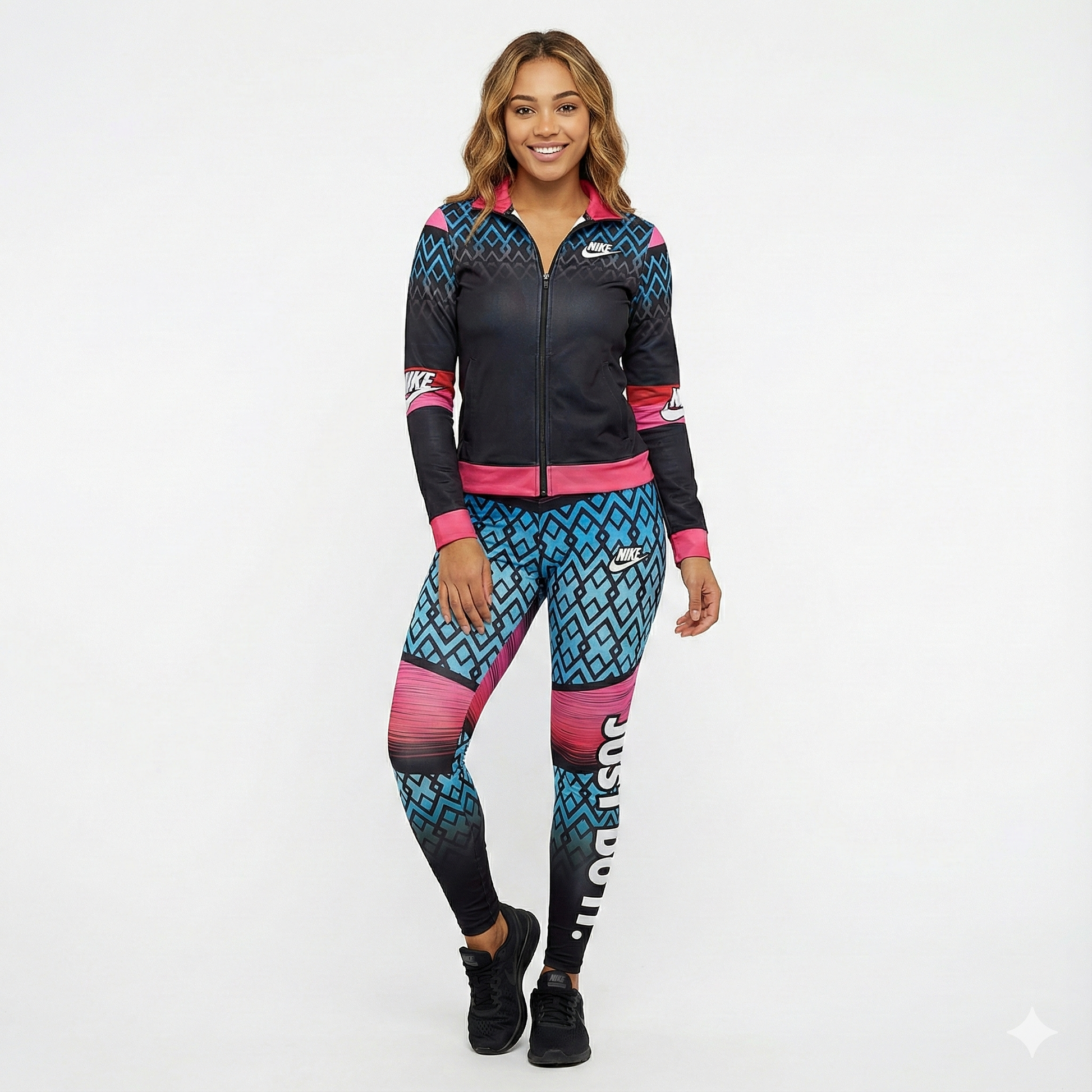 Este conjunto deportivo largo combina una chamarra de manga larga con cremallera frontal y leggins de compresión en lycra colombiana que moldea el cuerpo y realza tu silueta. El diseño gráfico aporta impacto visual mientras proporciona ajuste y soporte. Ideal para mujeres que proyectan fuerza, estilo y control en movimiento.
