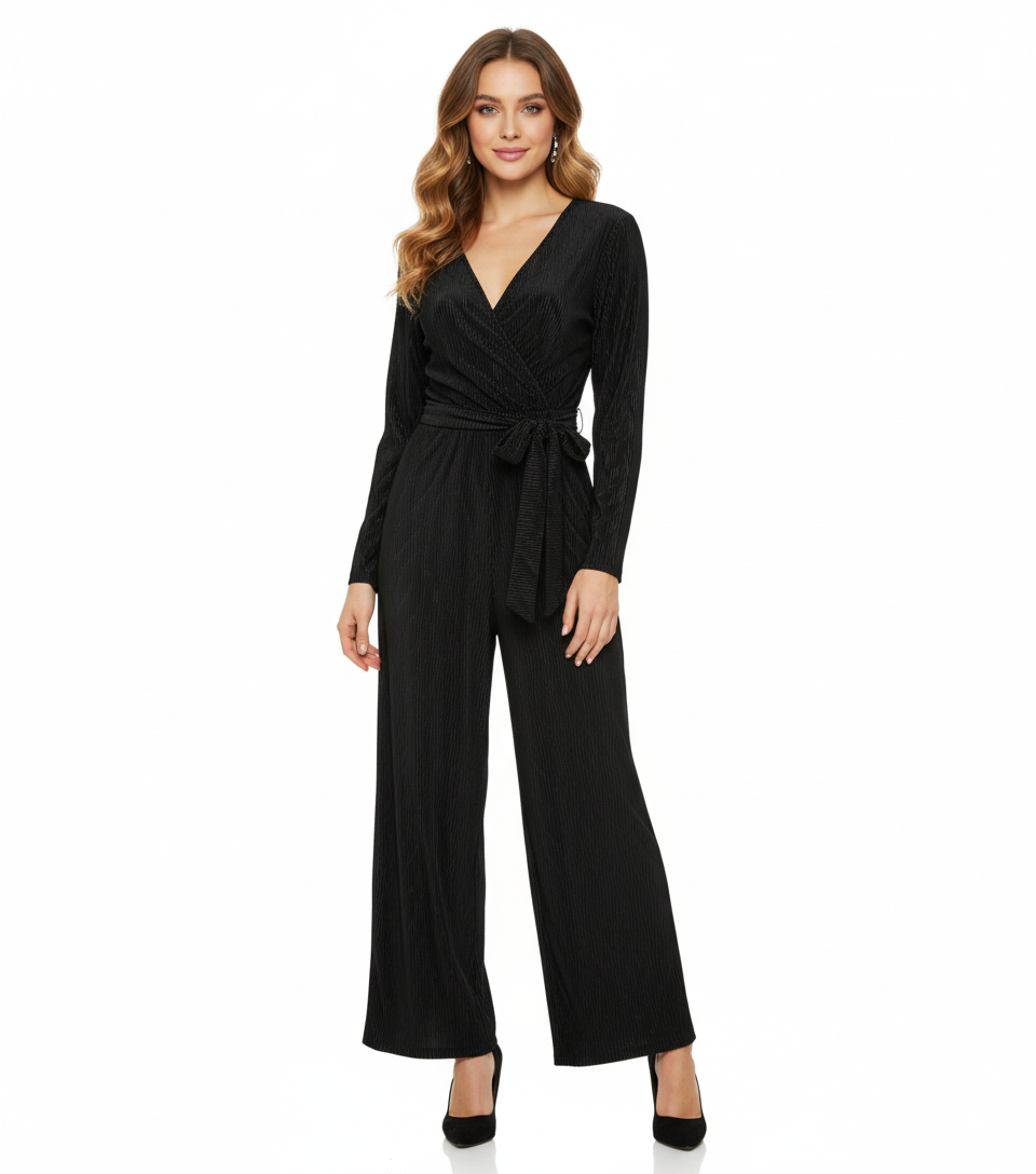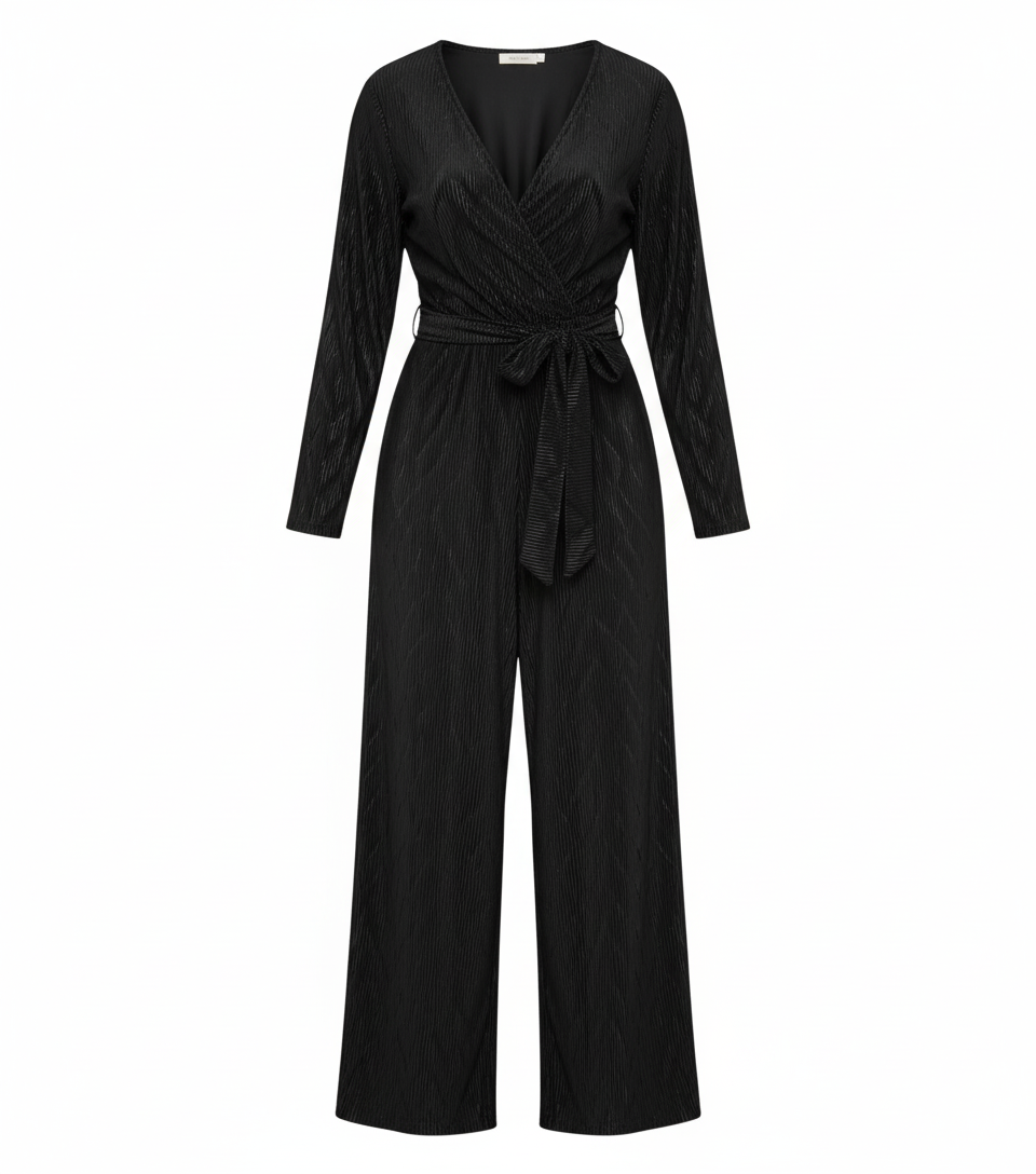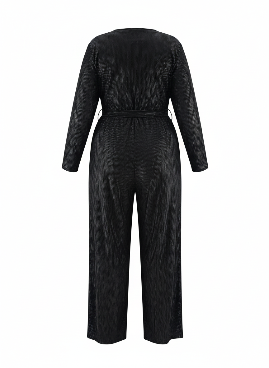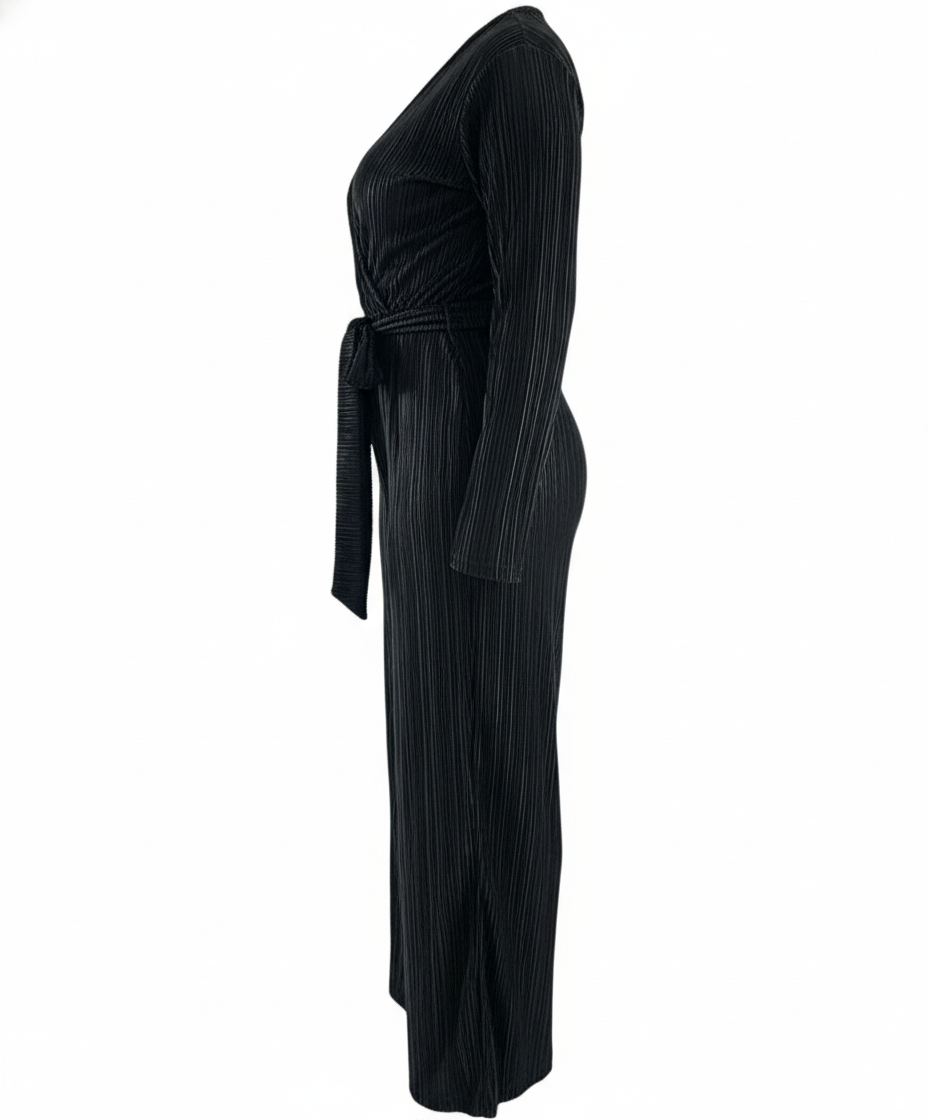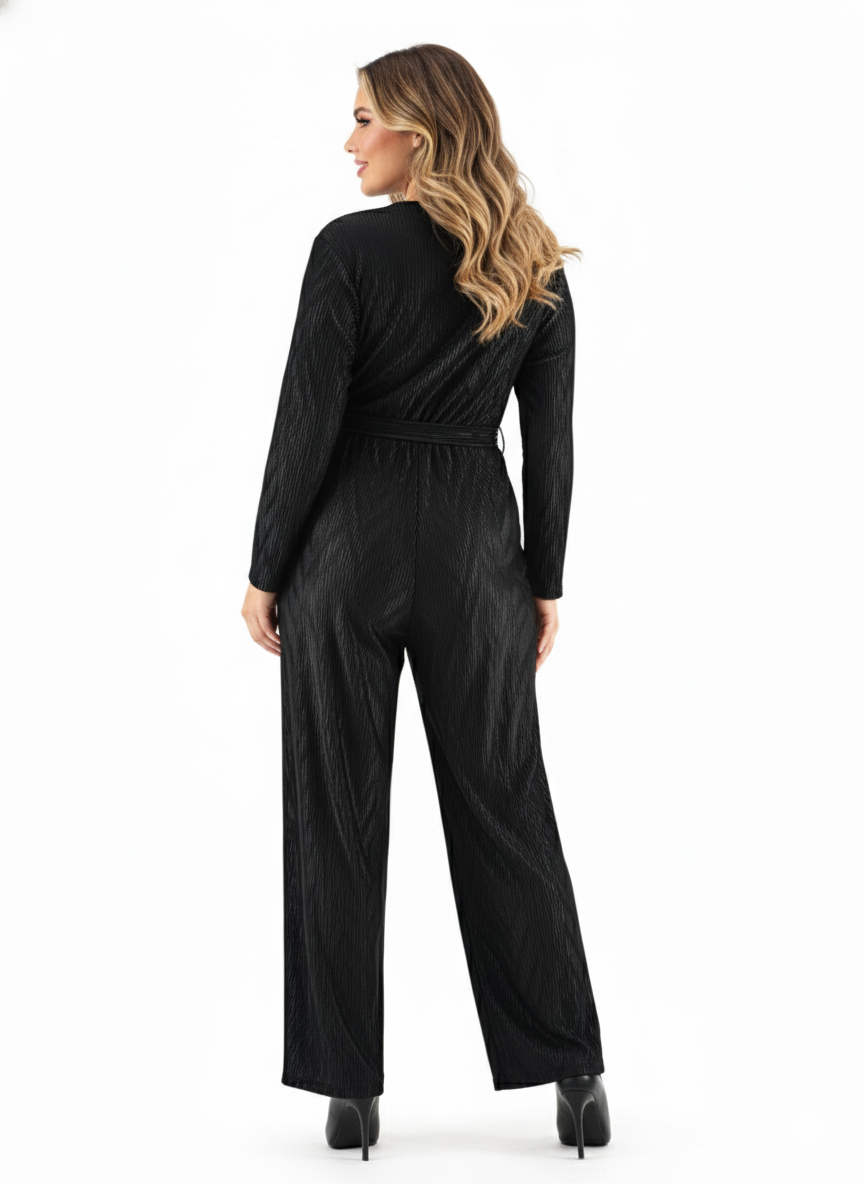 Este enterizo largo de manga larga y escote profundo en pico abraza el cuerpo con una textura de líneas que dibujan visualmente una figura más alargada y armónica. La cinta en la cintura permite un ajuste personalizado, marcando la silueta sin sacrificar la comodidad. Ideal para quienes buscan una prenda versátil que combine presencia elegante con libertad de movimiento.