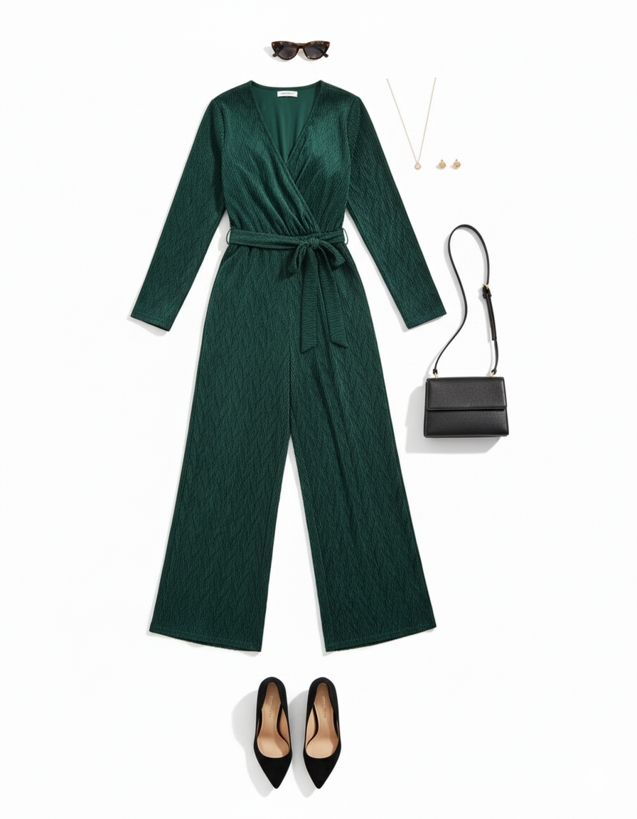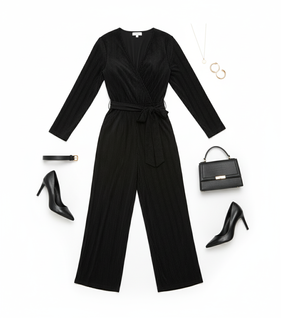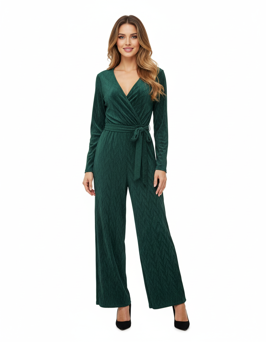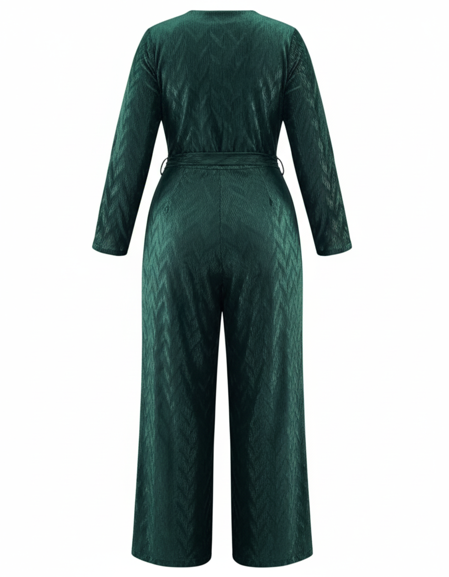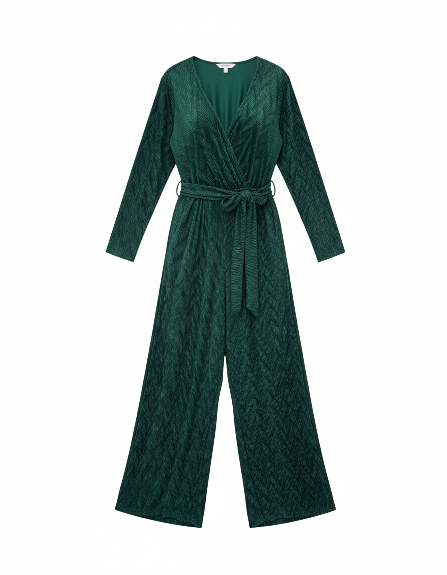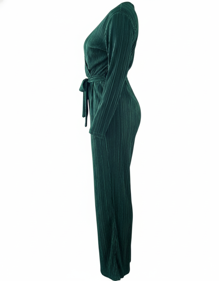 Este enterizo largo de manga larga y escote profundo en pico abraza el cuerpo con una textura de líneas que dibujan visualmente una figura más alargada y armónica. La cinta en la cintura permite un ajuste personalizado, marcando la silueta sin sacrificar la comodidad. Ideal para quienes buscan una prenda versátil que combine presencia elegante con libertad de movimiento.