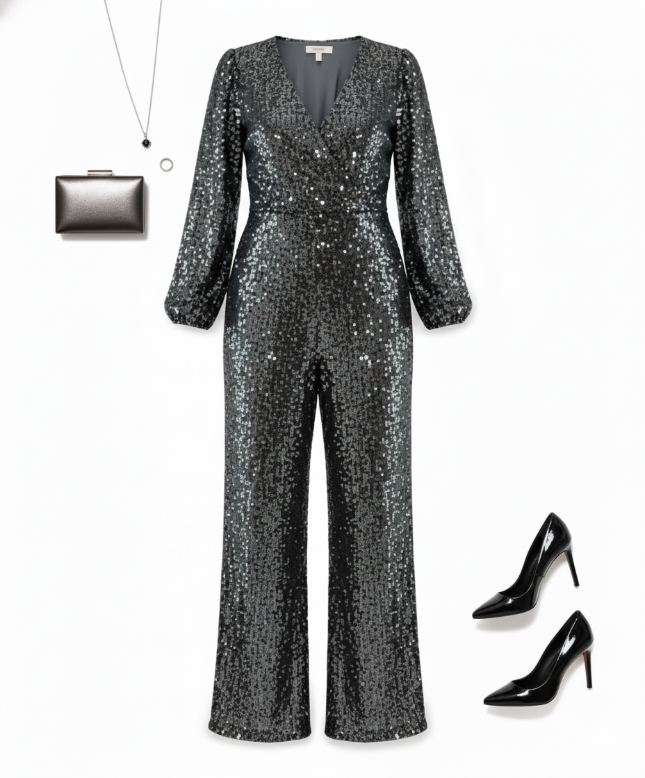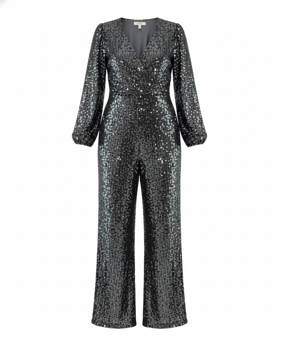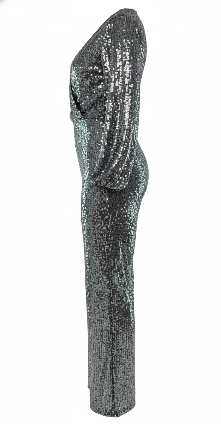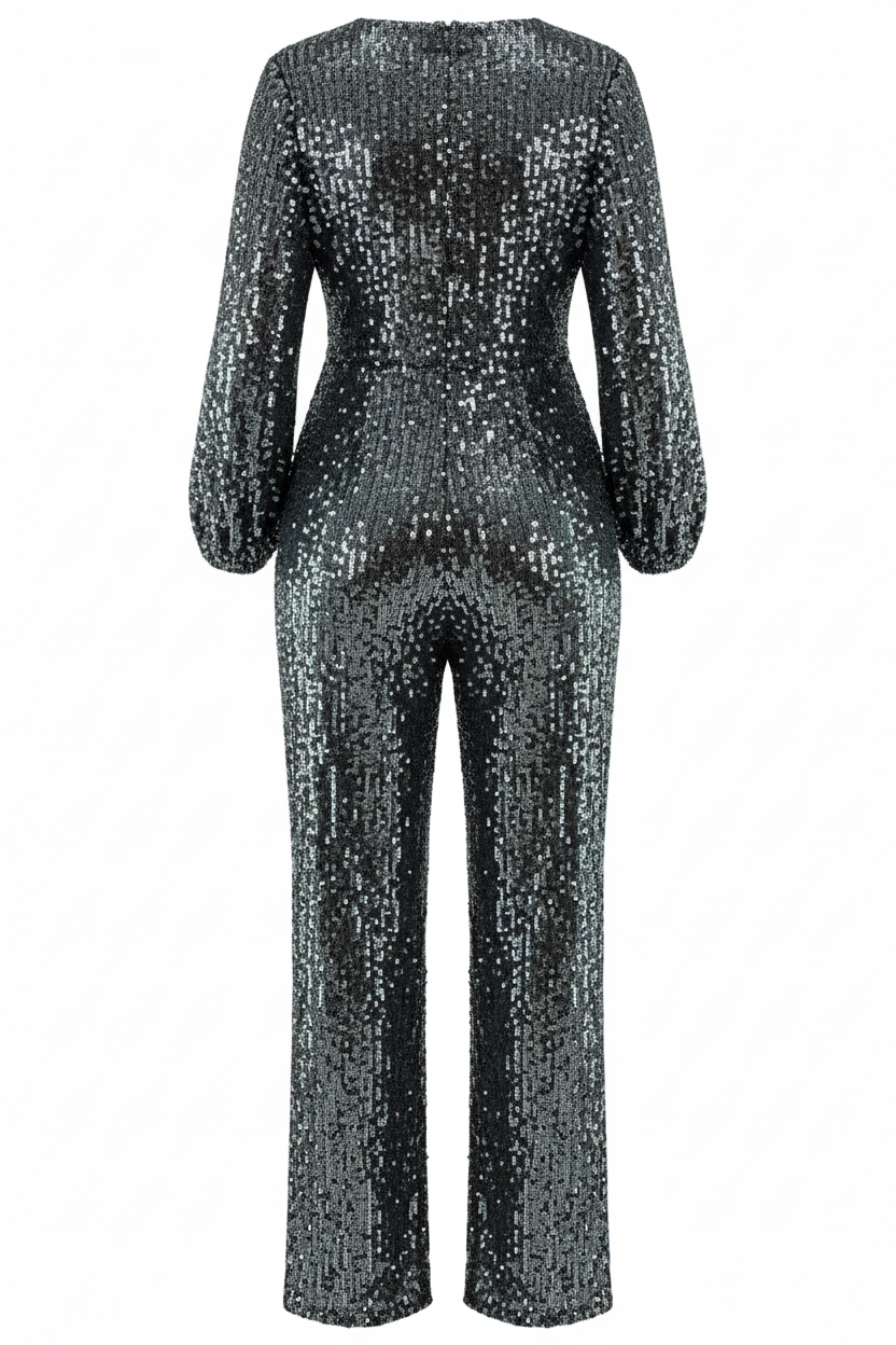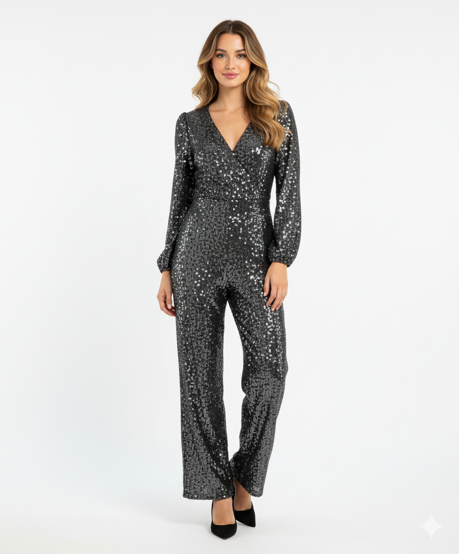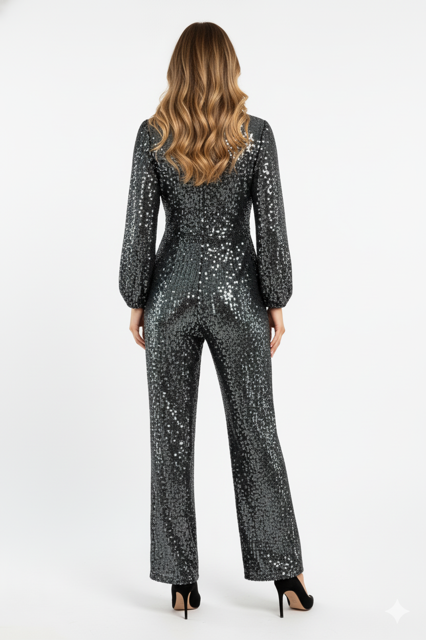 Este enterizo largo de lentejuelas con escote en V profundo y corte recto en las piernas es la combinación perfecta entre presencia y movimiento. La manga larga equilibra el brillo con un aire elegante, ideal para mujeres que disfrutan ser el centro de atención sin esfuerzo ni exageración.
