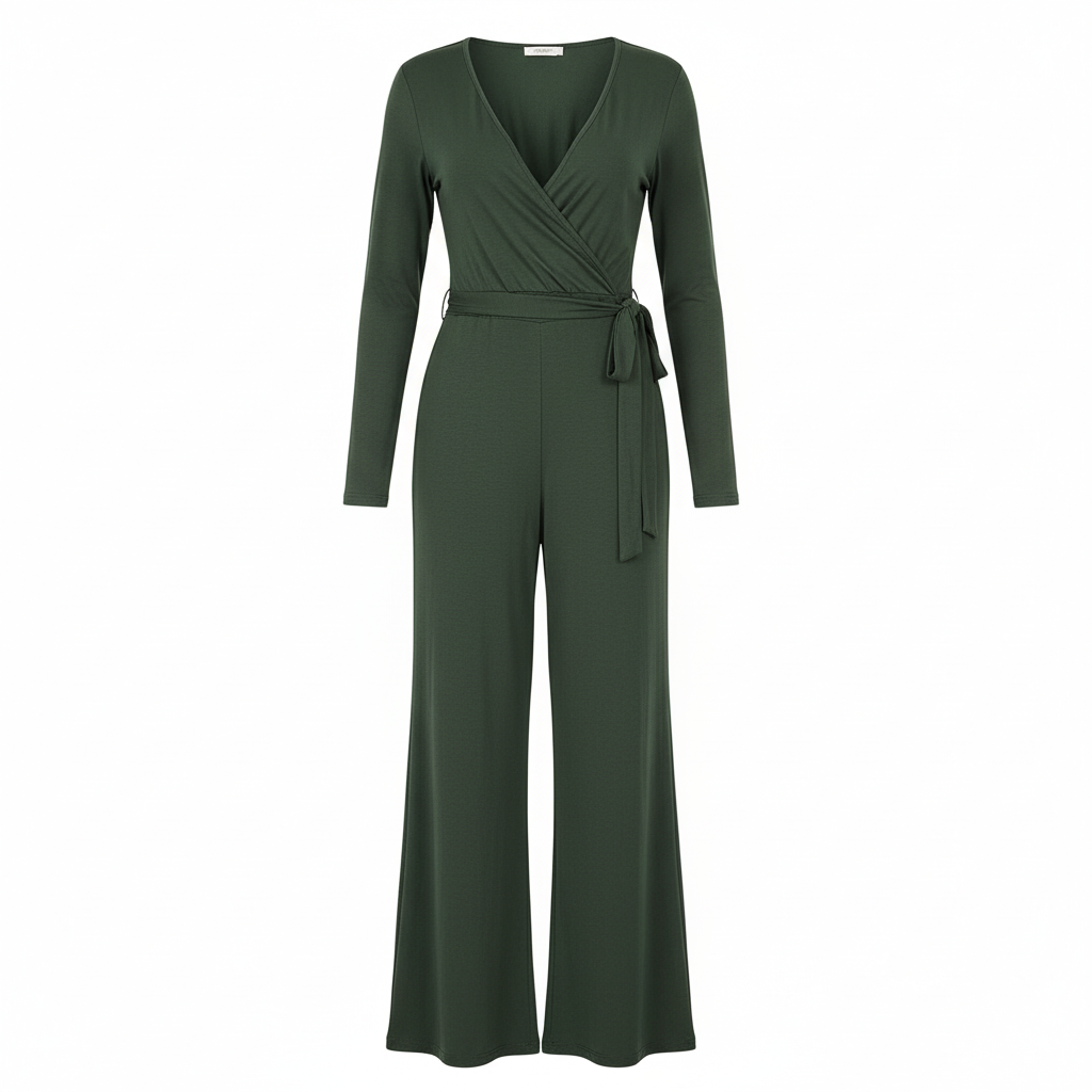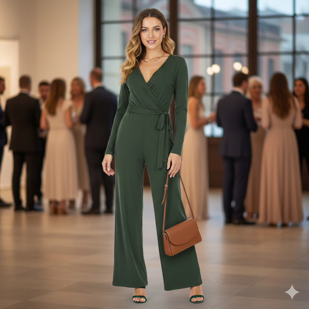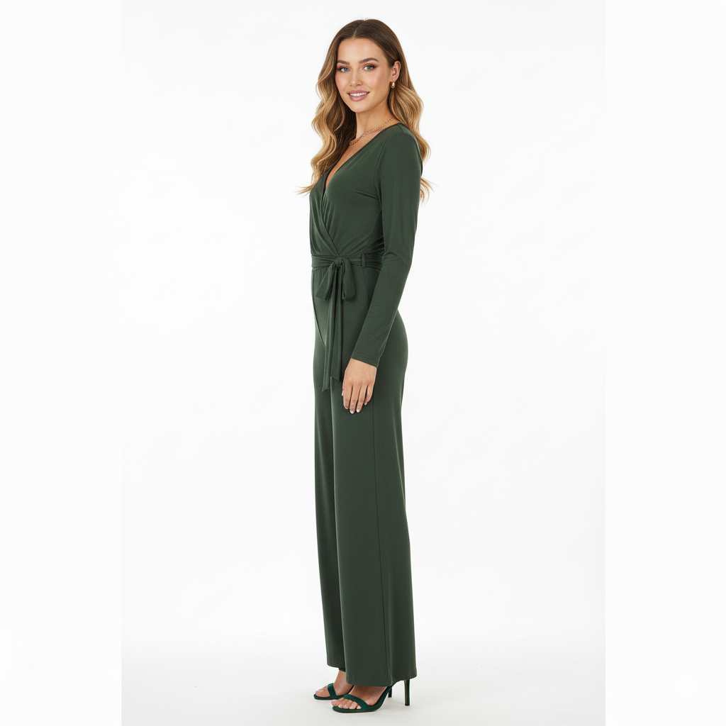 Este enterizo palazzo de manga larga envuelve tu silueta con suavidad y estructura. El escote en V cruzado al frente y el amarre en la cintura afinan visualmente el torso, mientras la caída acampanada alarga las piernas con distinción. Ideal para mujeres que proyectan seguridad sin necesidad de estridencias, su diseño ofrece elegancia fluida con un toque moderno y funcional.
