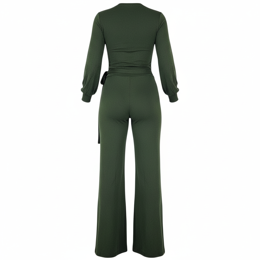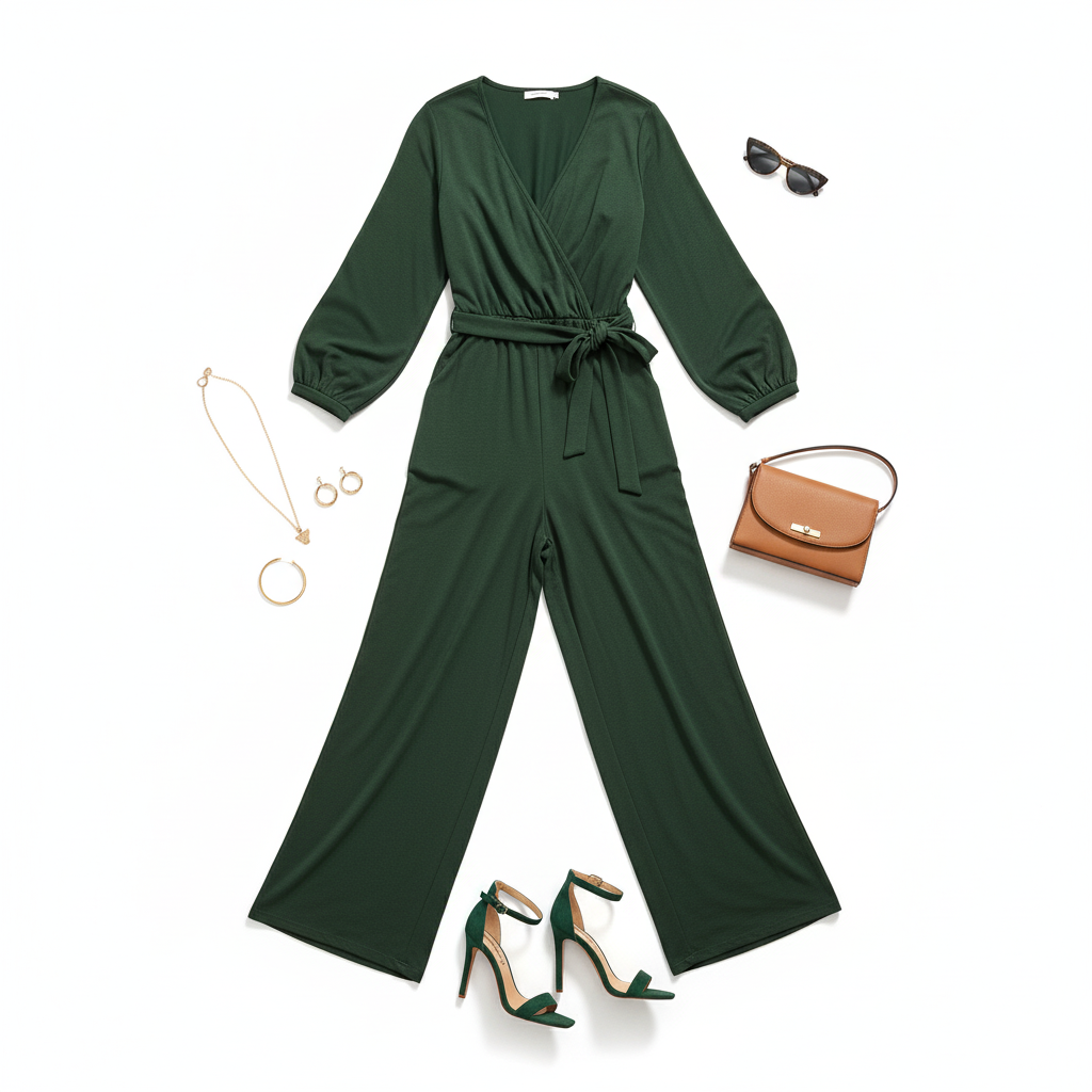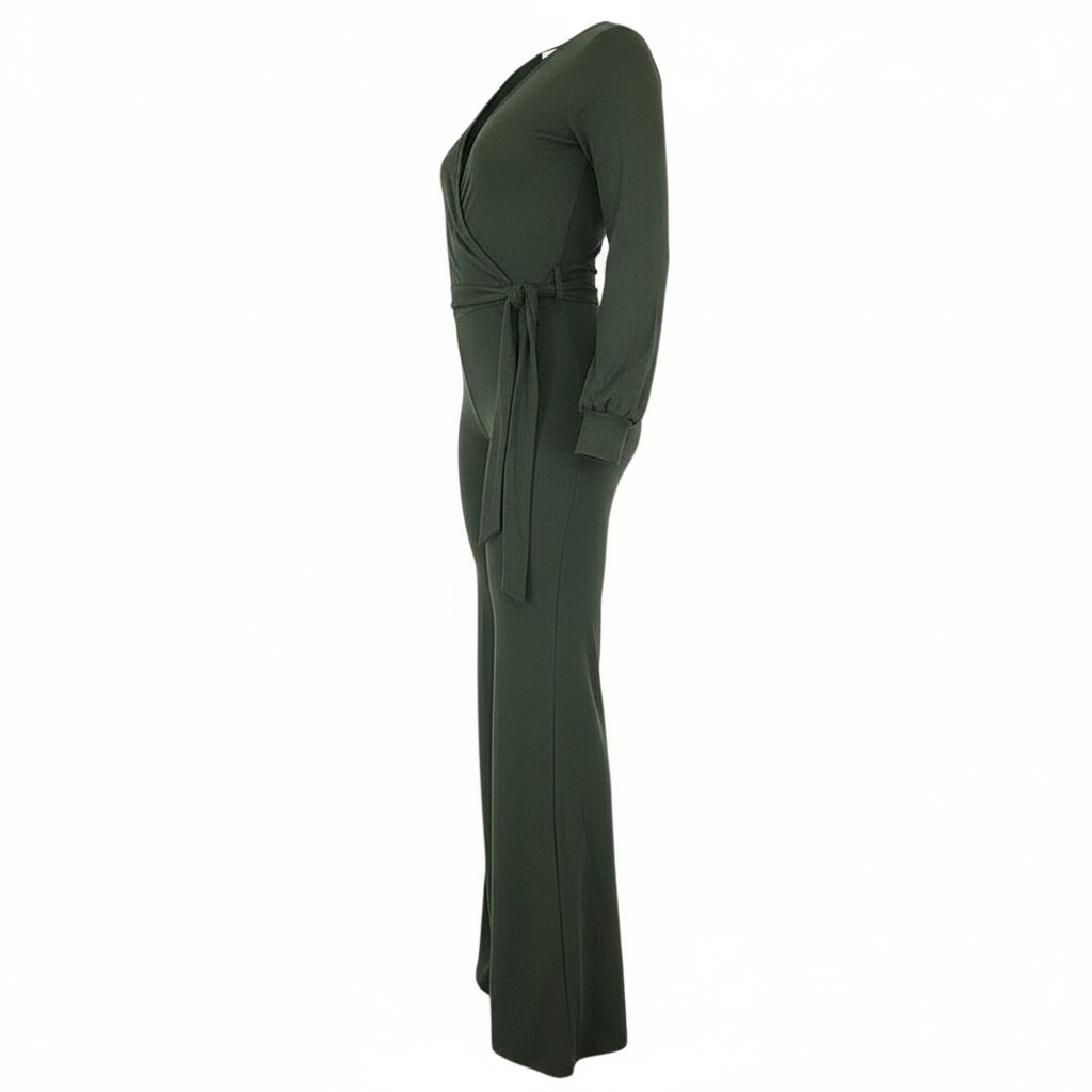 Este enterizo palazzo de manga larga envuelve tu silueta con suavidad y estructura. El escote en V cruzado al frente y el amarre en la cintura afinan visualmente el torso, mientras la caída acampanada alarga las piernas con distinción. Ideal para mujeres que proyectan seguridad sin necesidad de estridencias, su diseño ofrece elegancia fluida con un toque moderno y funcional.