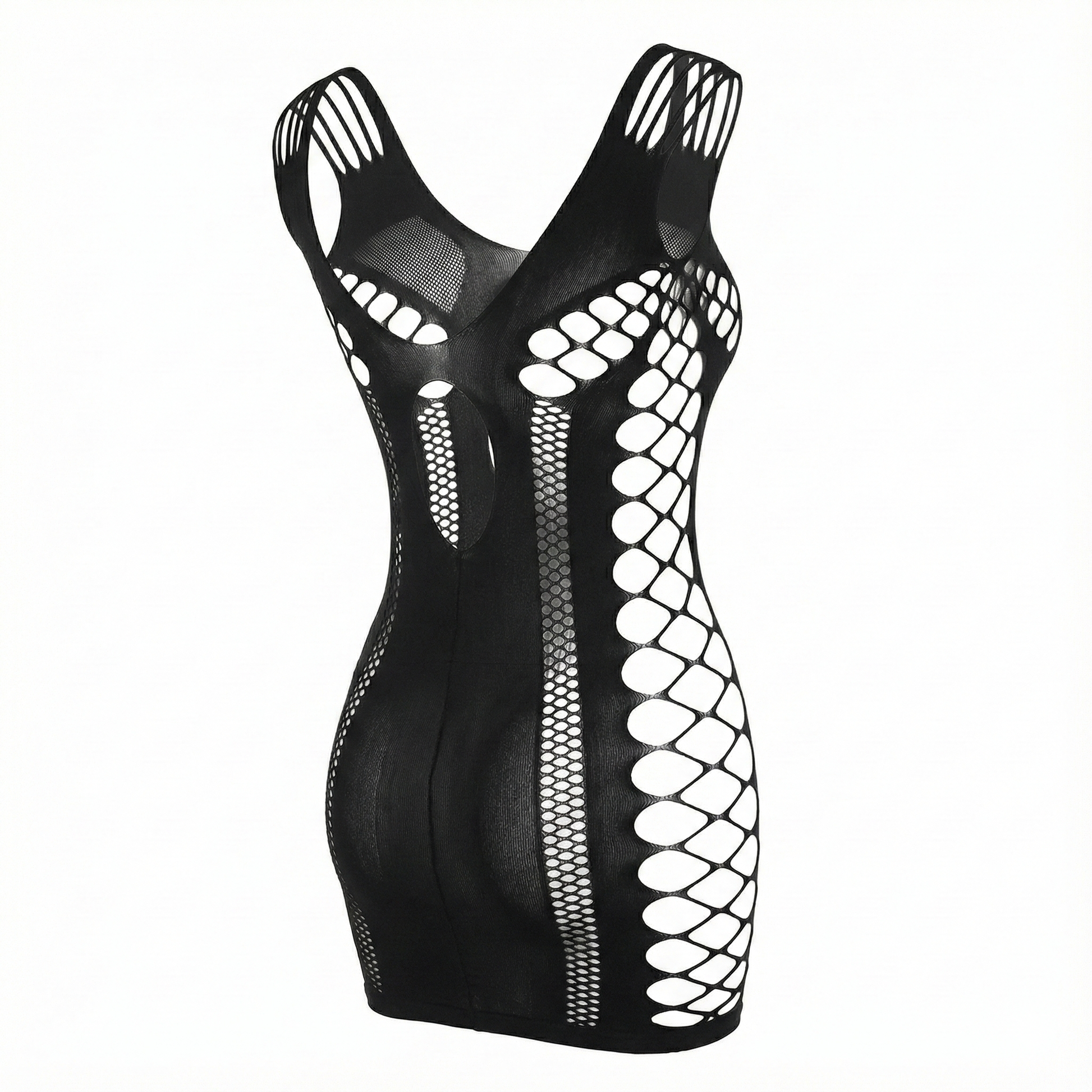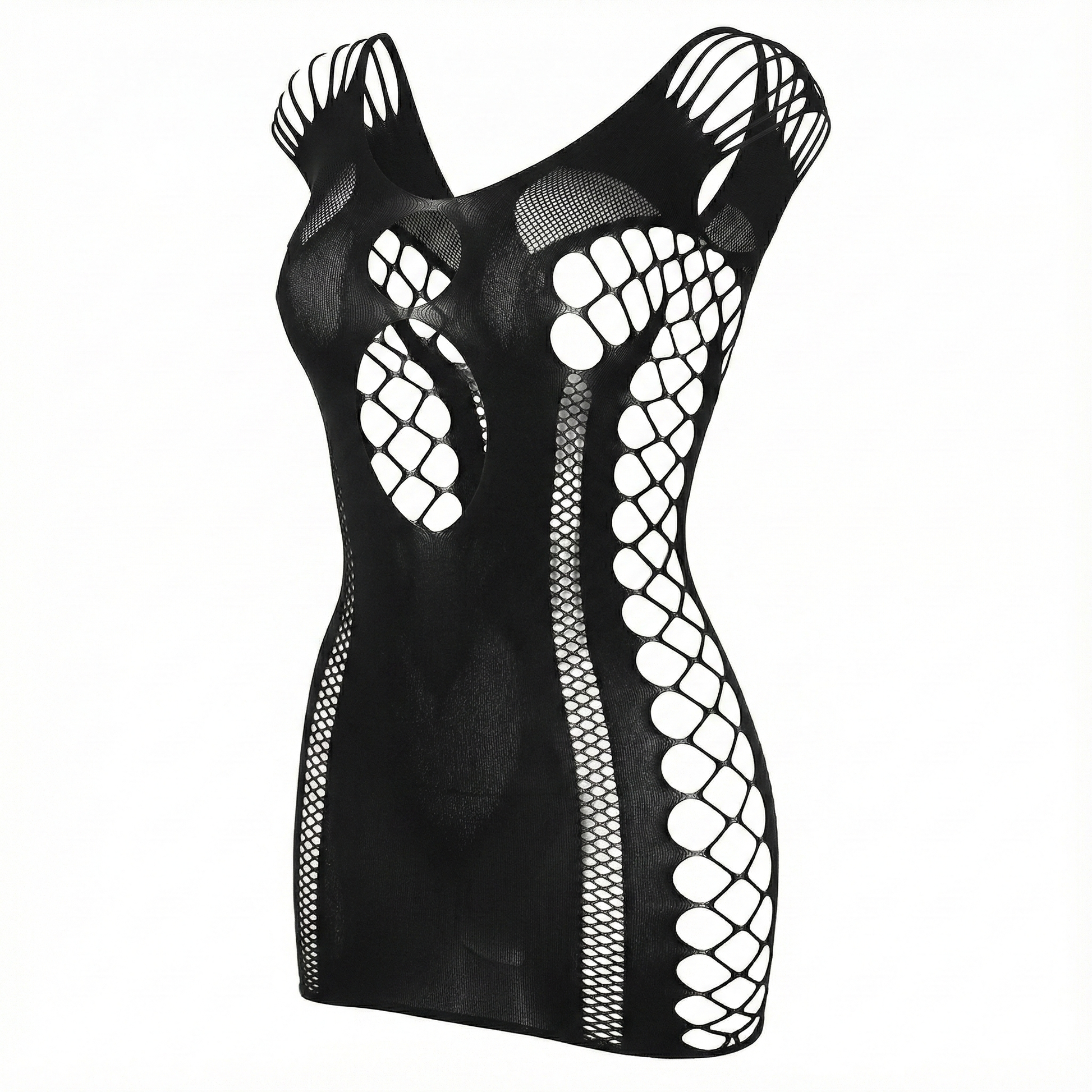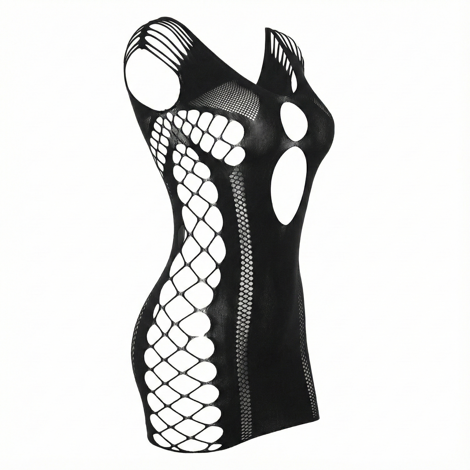 Este minivestido de lencería está diseñado para resaltar lo mejor de ti con un enfoque visual impactante. Las aberturas laterales tipo red crean una silueta hipnótica, mientras el diseño de malla negra abraza cada curva con firmeza y estilo. La combinación de cortes estratégicos, hombros descubiertos y espalda profunda proyecta confianza, magnetismo y una feminidad sin inhibiciones.