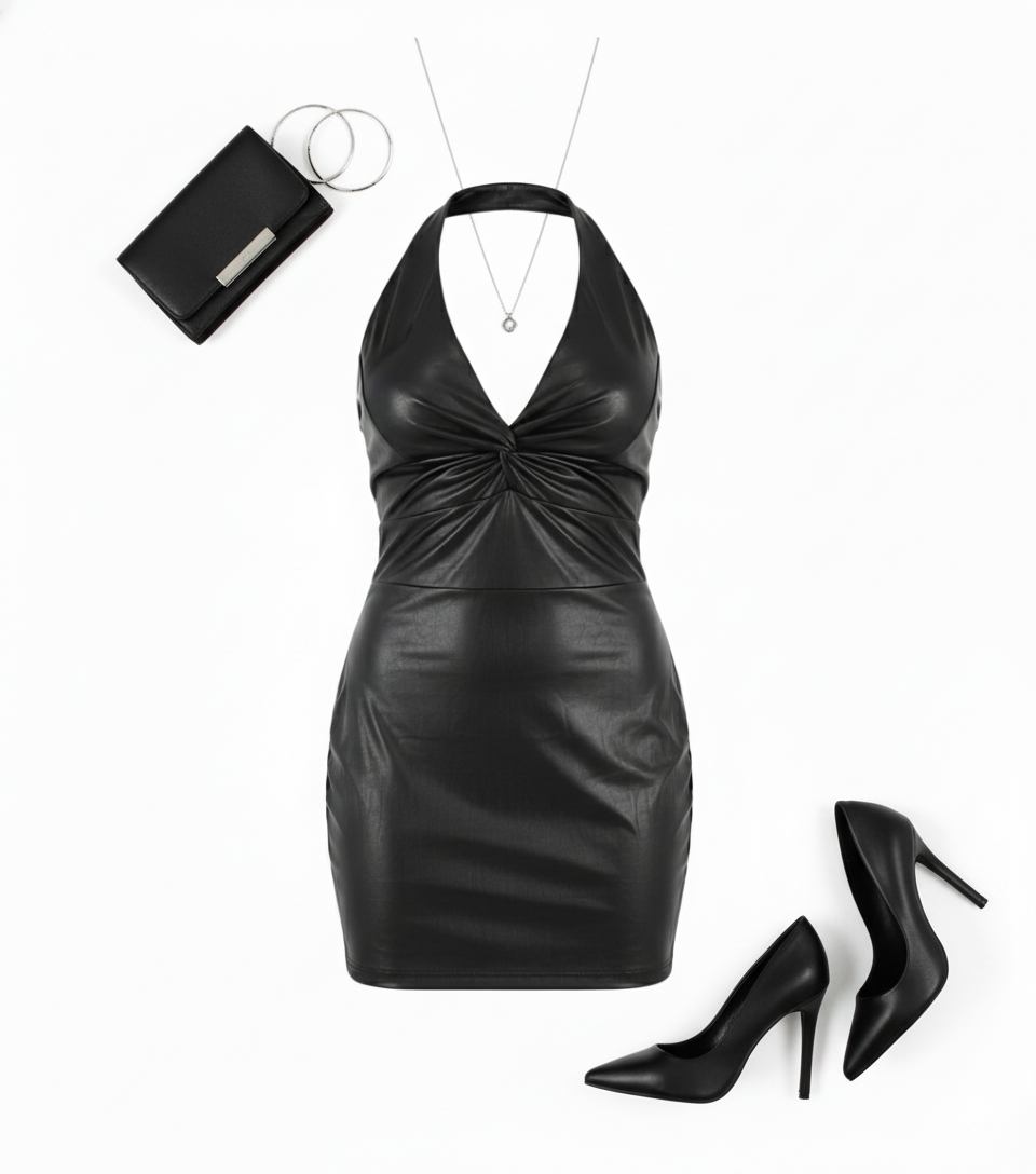 Este minivestido ajustado de vinil abraza tu cuerpo con actitud provocadora. El escote en V profundo, combinado con el fruncido en busto y la espalda descubierta, lo convierten en una prenda de alto impacto visual. Diseñado para mujeres que no temen destacar, su efecto brillante potencia la figura con una silueta definida y atrevida.