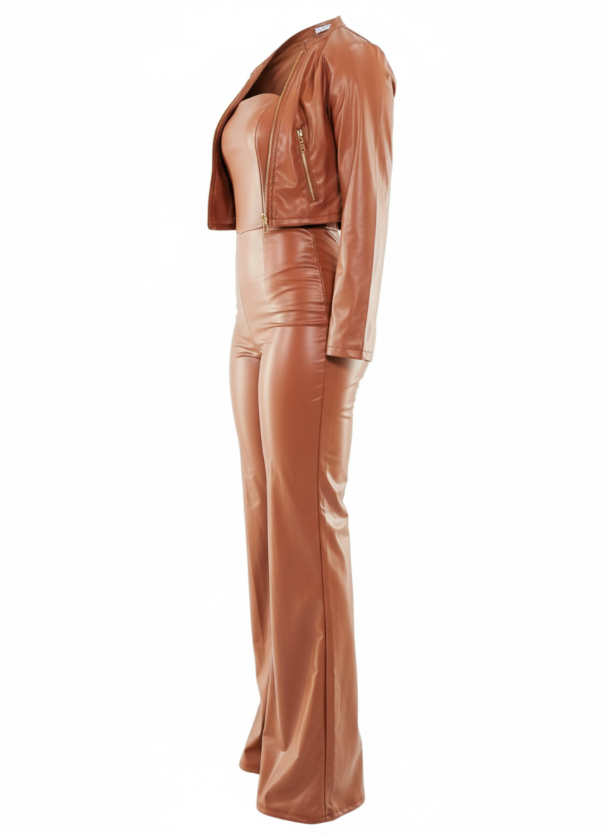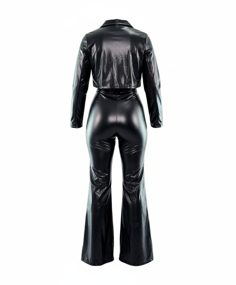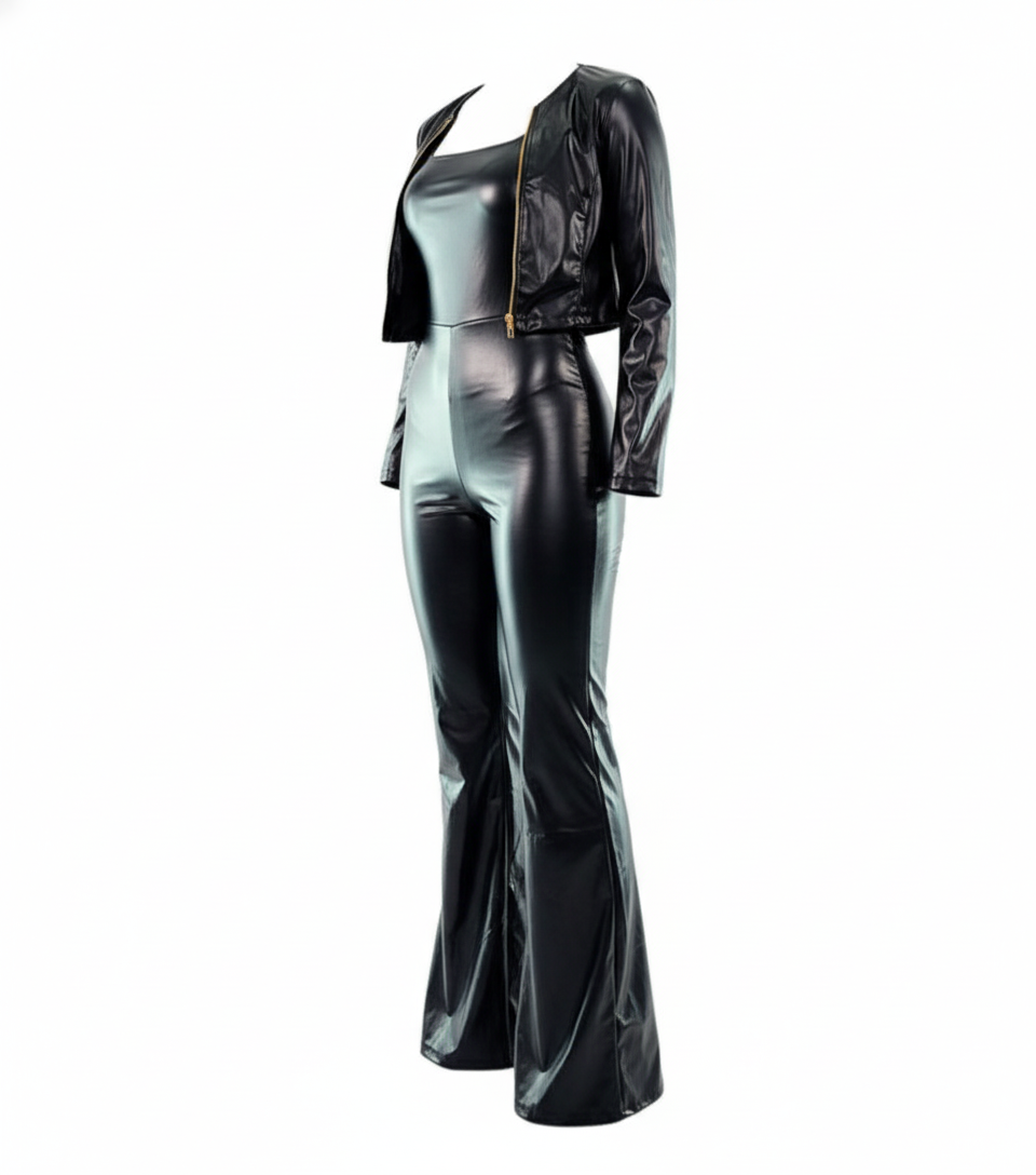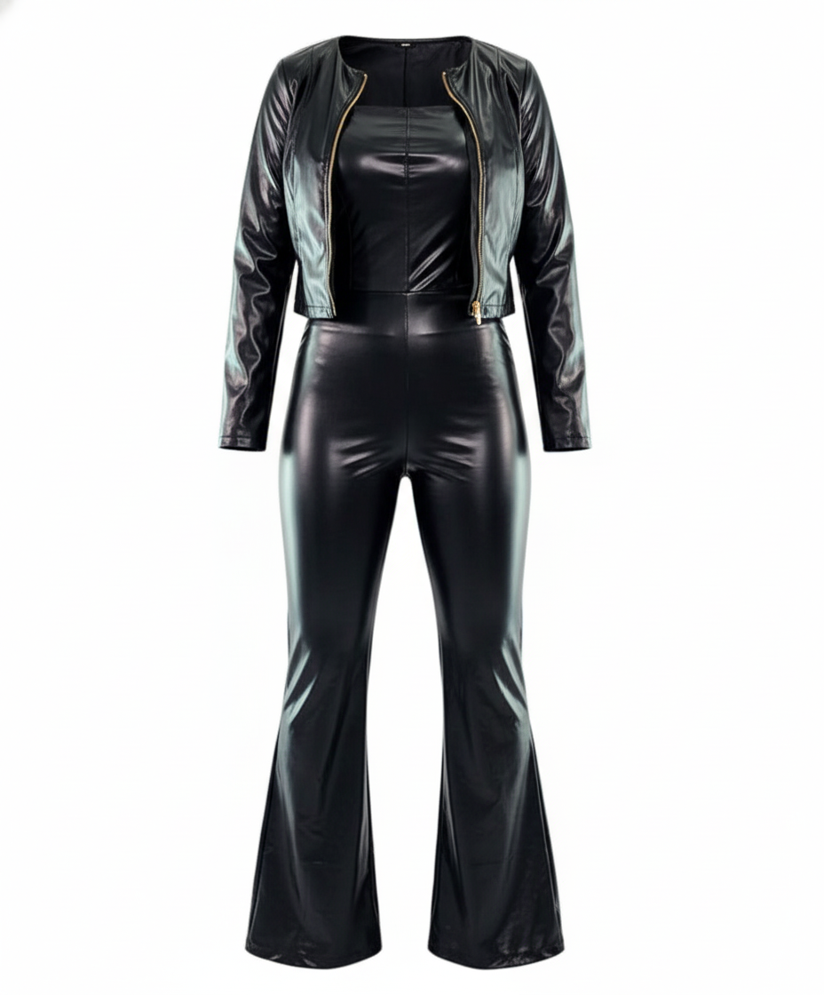 Este conjunto tipo palazzo de vinipiel brillante es una declaración de estilo. Su escote strapless, pantalón acampanado y chaqueta corta al tono crean un look poderoso y atrevido, ideal para quienes no temen destacar. El acabado vinílico añade un brillo sofisticado que evoca seguridad, audacia y elegancia moderna en un solo atuendo.