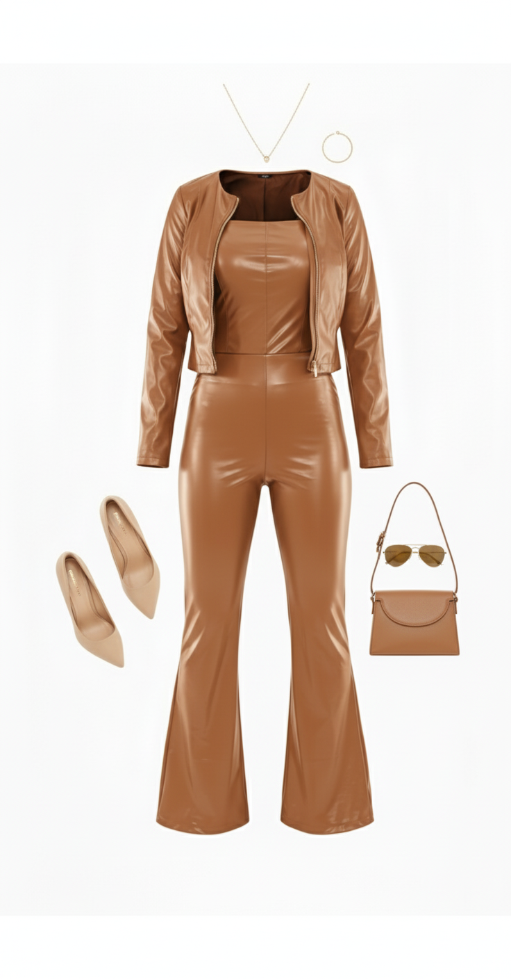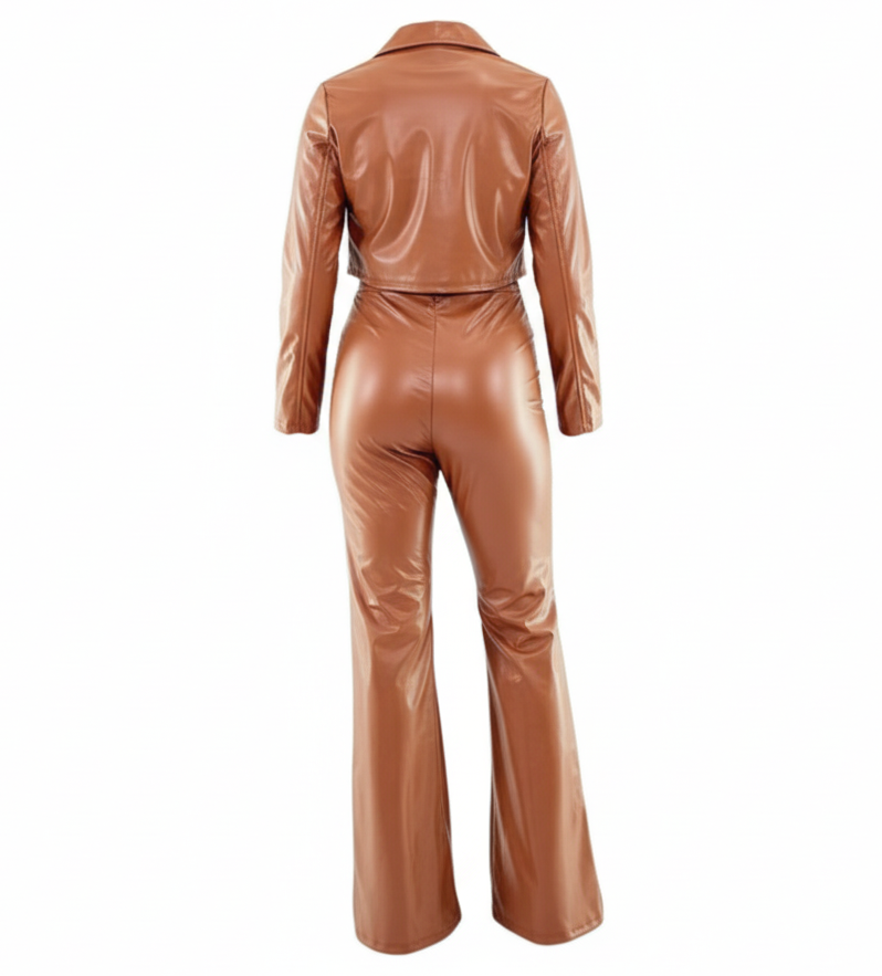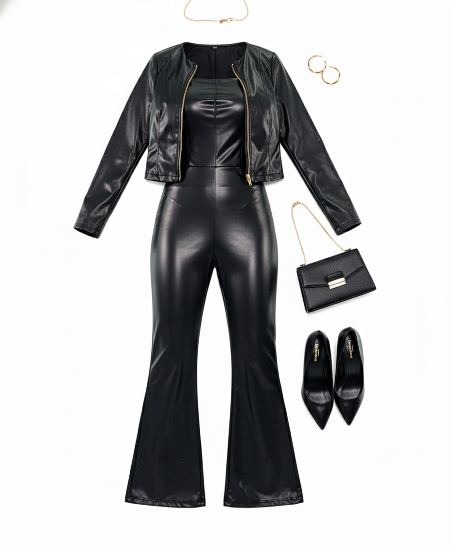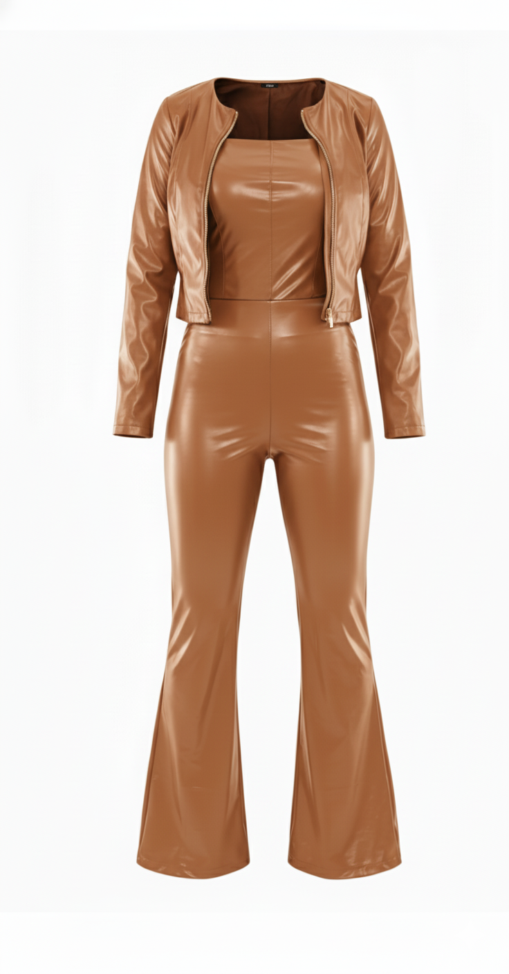 Este conjunto tipo palazzo de vinipiel brillante es una declaración de estilo. Su escote strapless, pantalón acampanado y chaqueta corta al tono crean un look poderoso y atrevido, ideal para quienes no temen destacar. El acabado vinílico añade un brillo sofisticado que evoca seguridad, audacia y elegancia moderna en un solo atuendo.