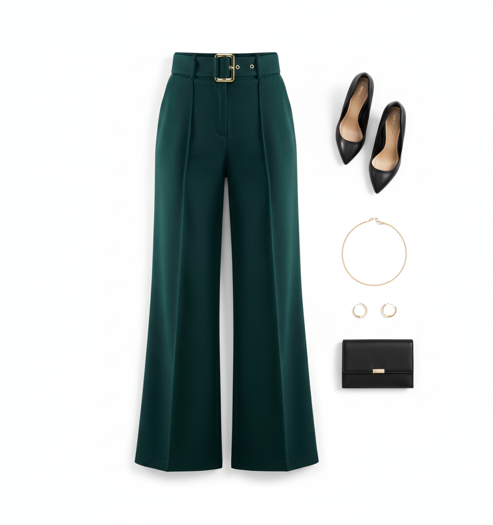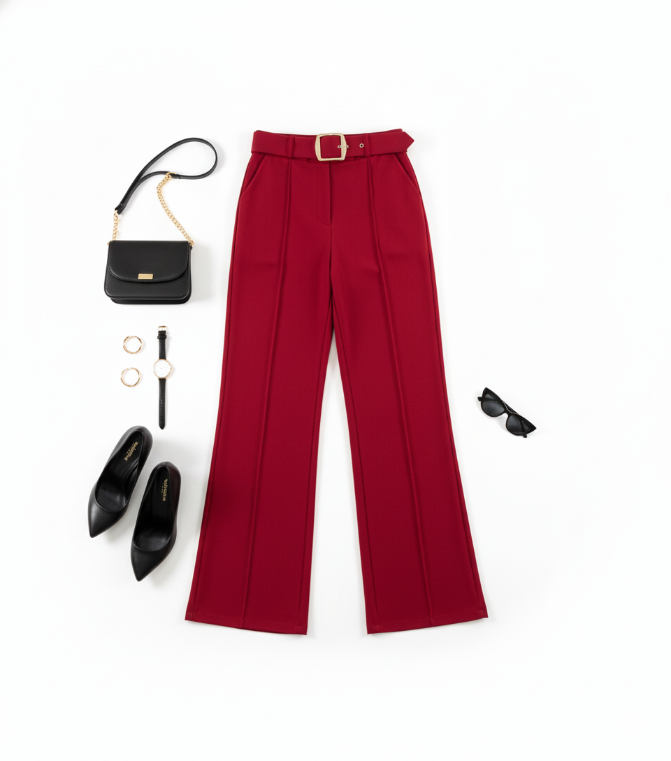 Este pantalón acampanado de corte clásico con pinzas al frente y cinturón integrado es ideal para resaltar la cintura y alargar la figura con sofisticación. Su silueta estructurada proyecta seguridad con un estilo versátil, perfecto para mujeres que combinan poder visual con comodidad. El diseño equilibra lo llamativo con lo refinado, ideal para destacar con armonía.