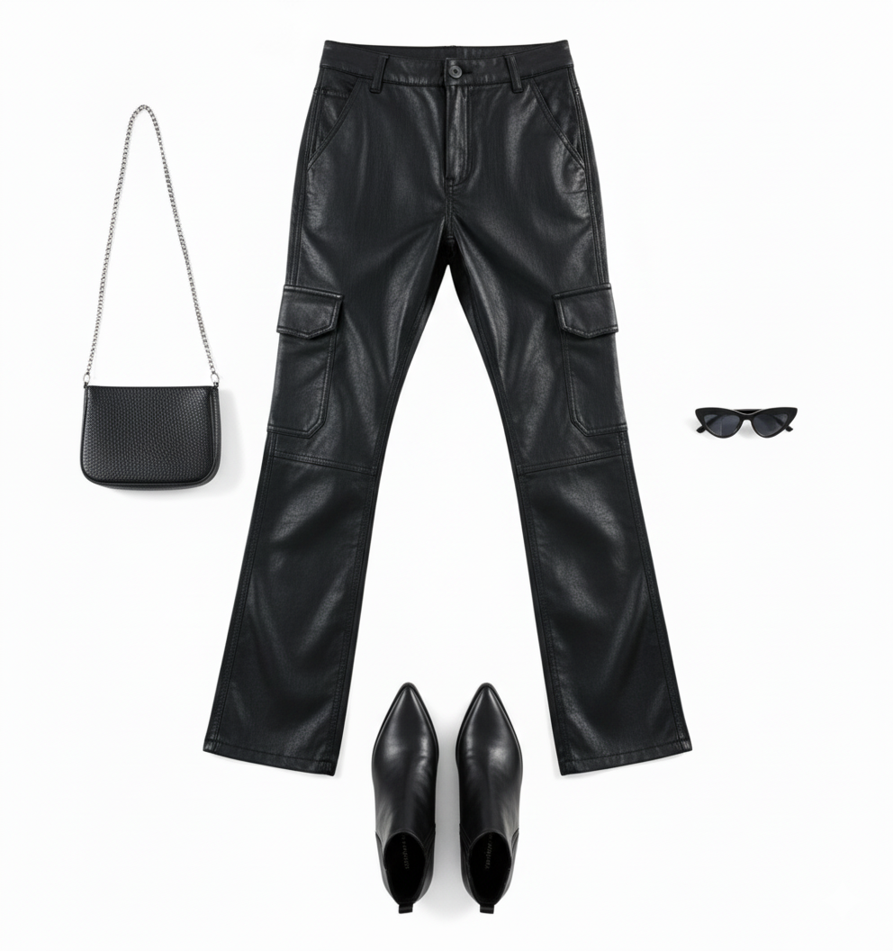 Este pantalón de vinil recto con cinturón incluido y bolsillos laterales tipo cargo es la declaración perfecta de seguridad y audacia. Su brillo metálico proyecta una imagen de poder moderno, mientras el corte clásico permite libertad sin sacrificar impacto. Ideal para salir con amigas o eventos donde se requiere presencia firme y look dominante.