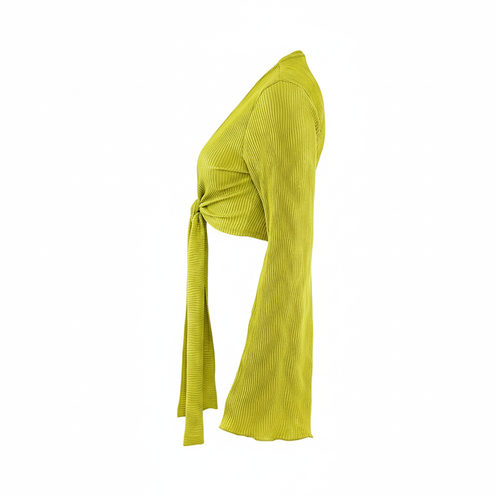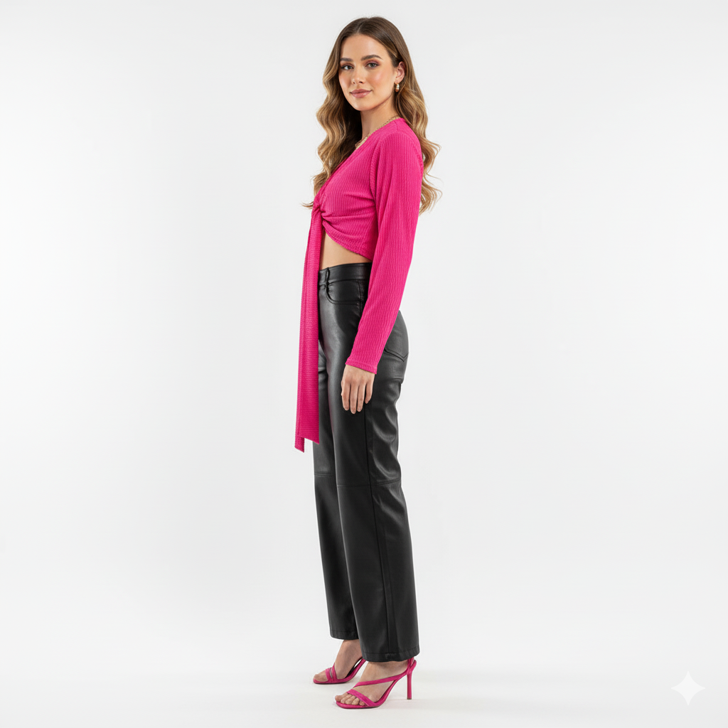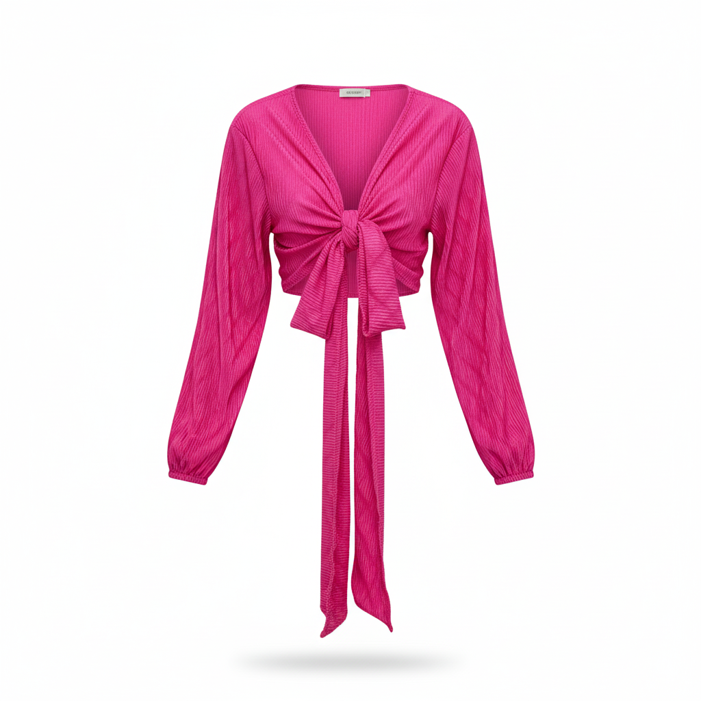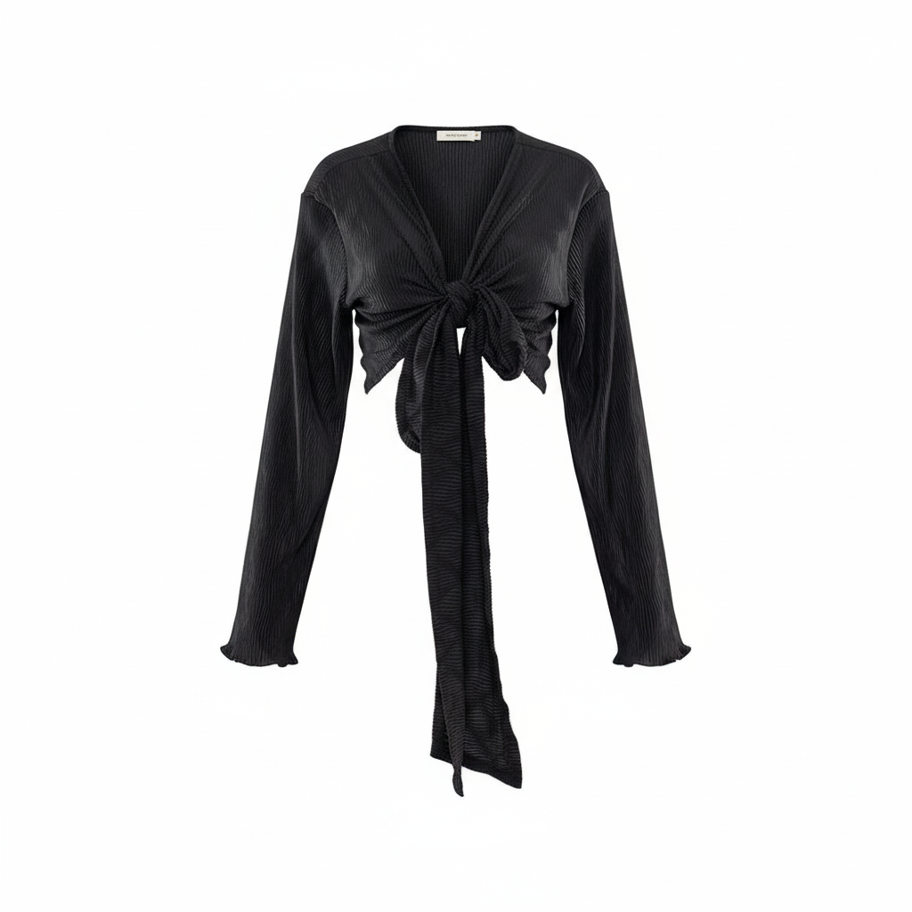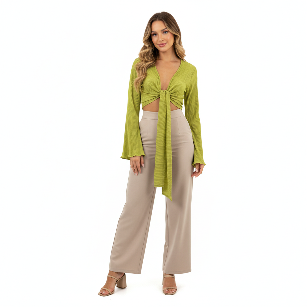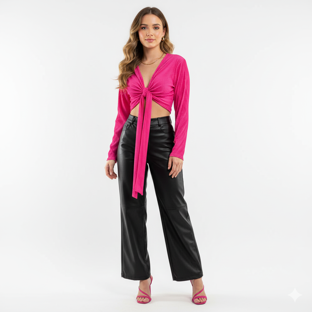 Este top de manga larga con escote profundo y amarre delantero combina frescura, actitud y libertad visual. Sus mangas amplias fluyen con cada movimiento, mientras que el nudo central enmarca la cintura de forma favorecedora. Ideal para looks que requieren un giro moderno y desenfadado sin perder estilo.