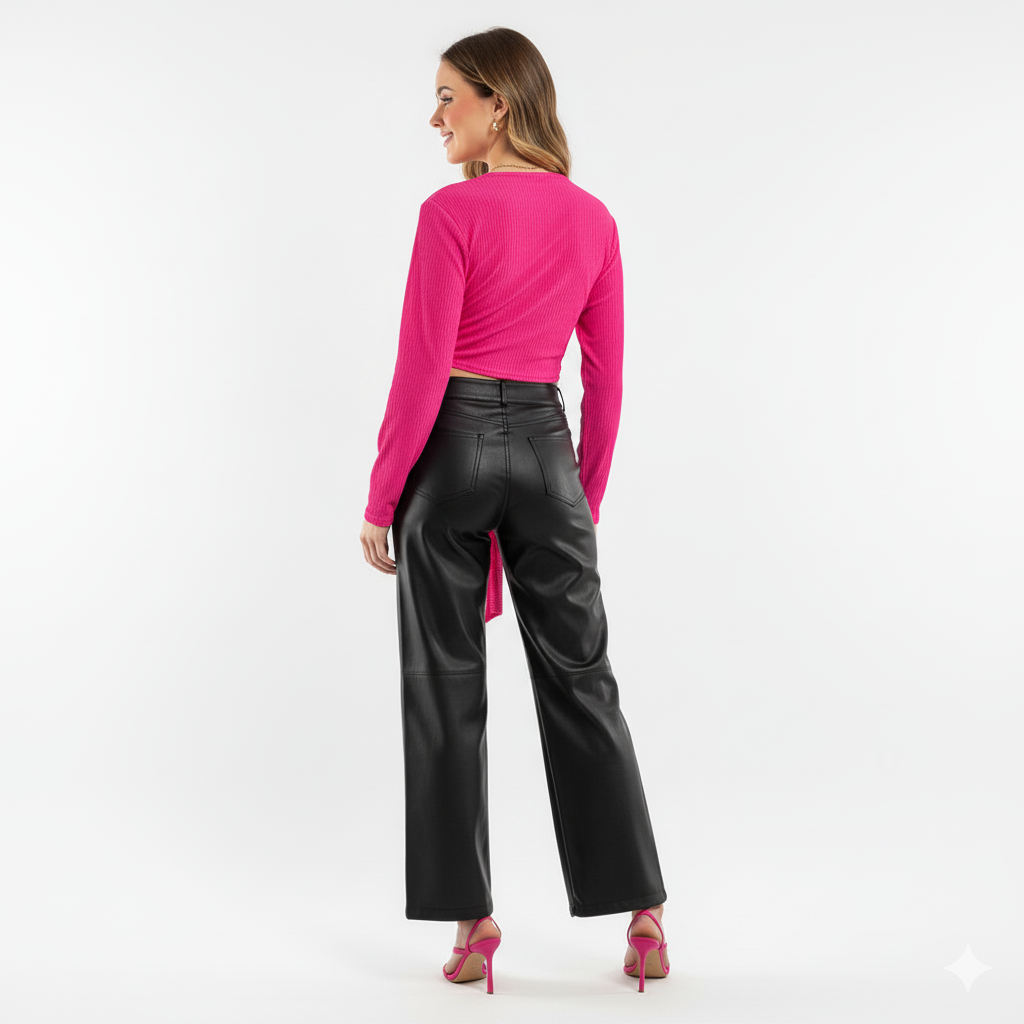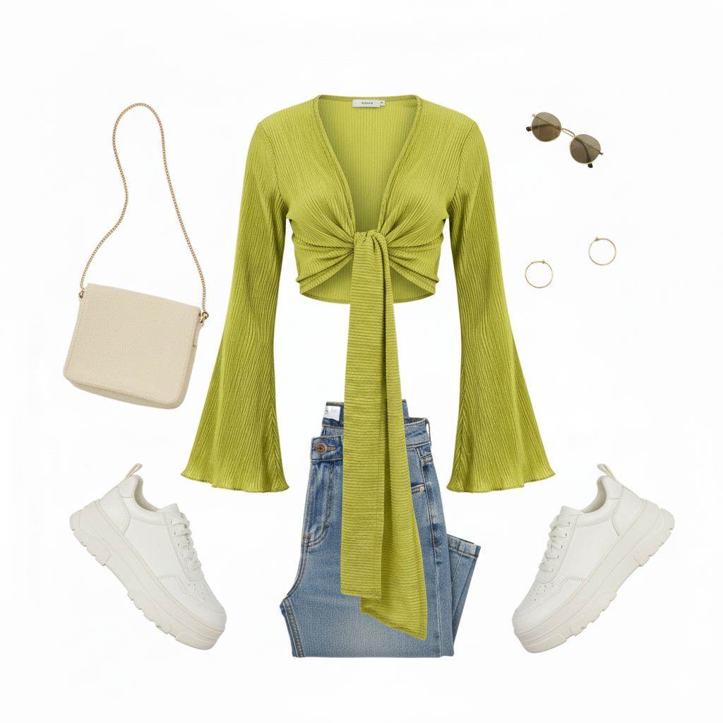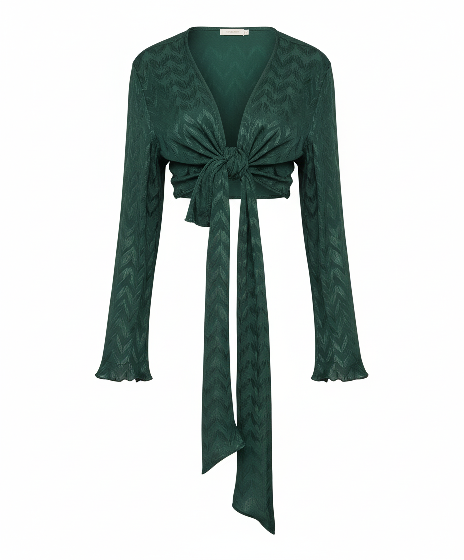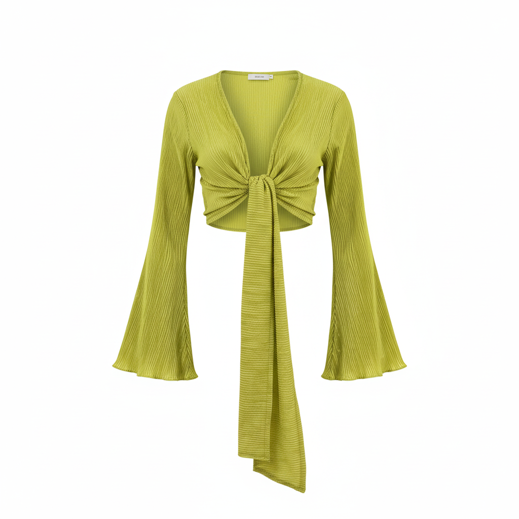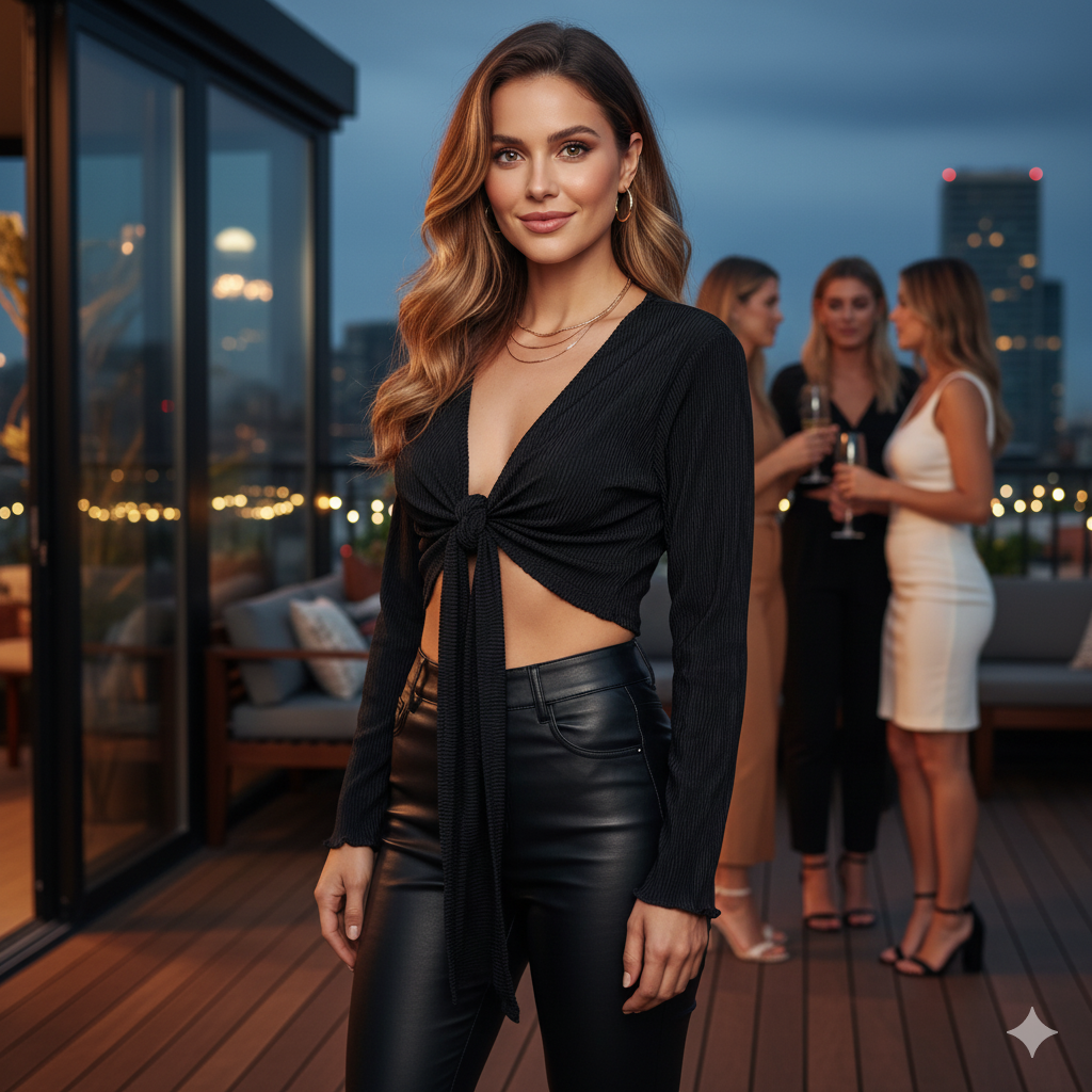 Este top de manga larga con escote profundo y amarre delantero combina frescura, actitud y libertad visual. Sus mangas amplias fluyen con cada movimiento, mientras que el nudo central enmarca la cintura de forma favorecedora. Ideal para looks que requieren un giro moderno y desenfadado sin perder estilo.