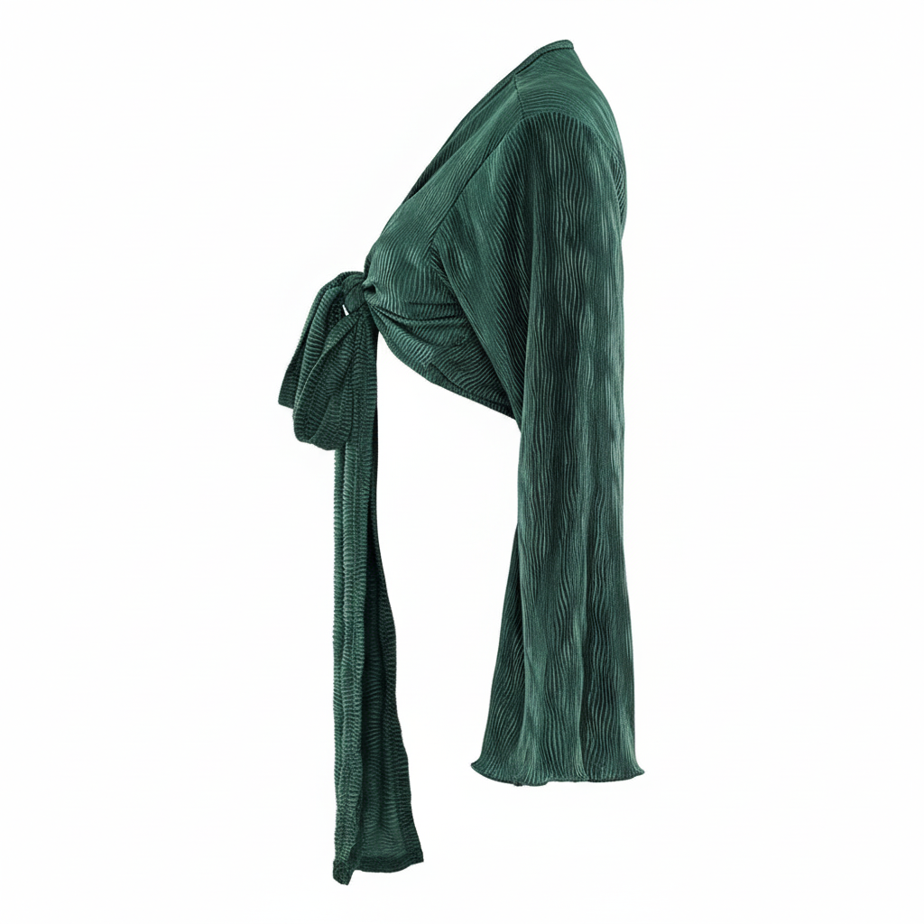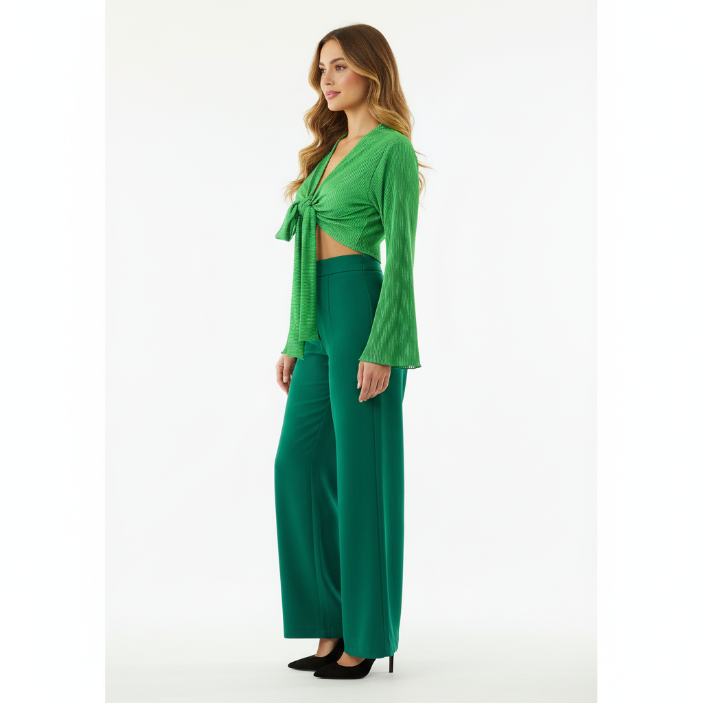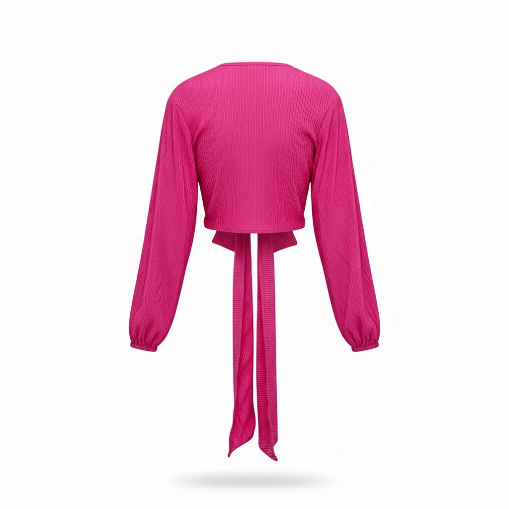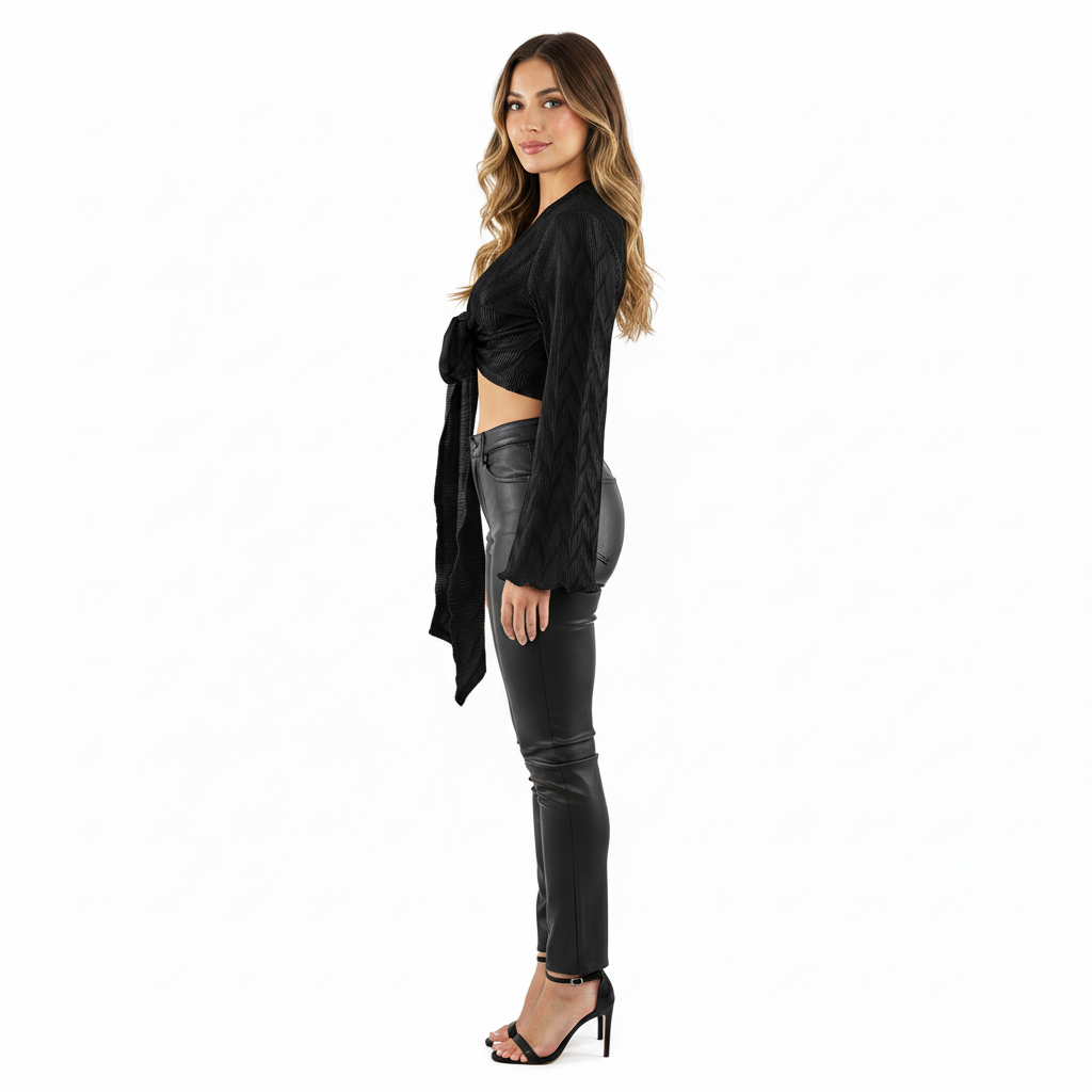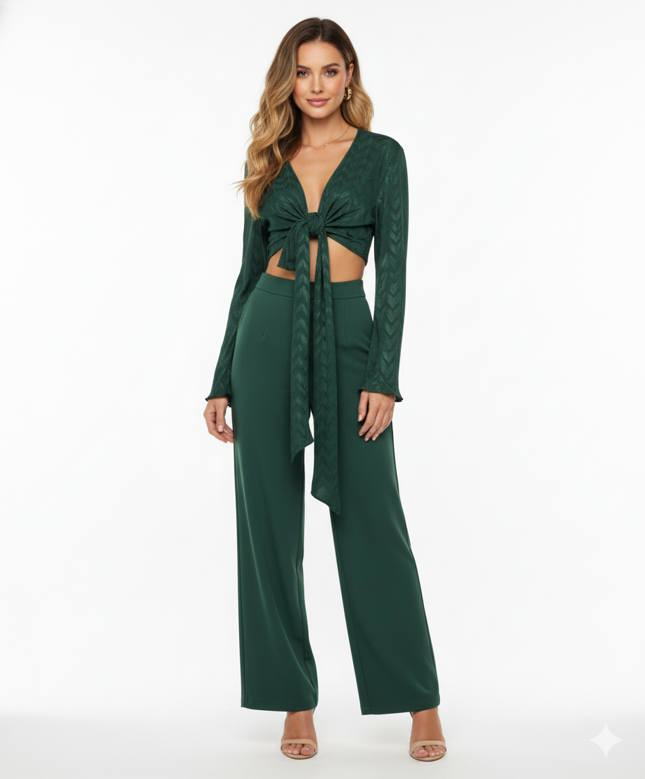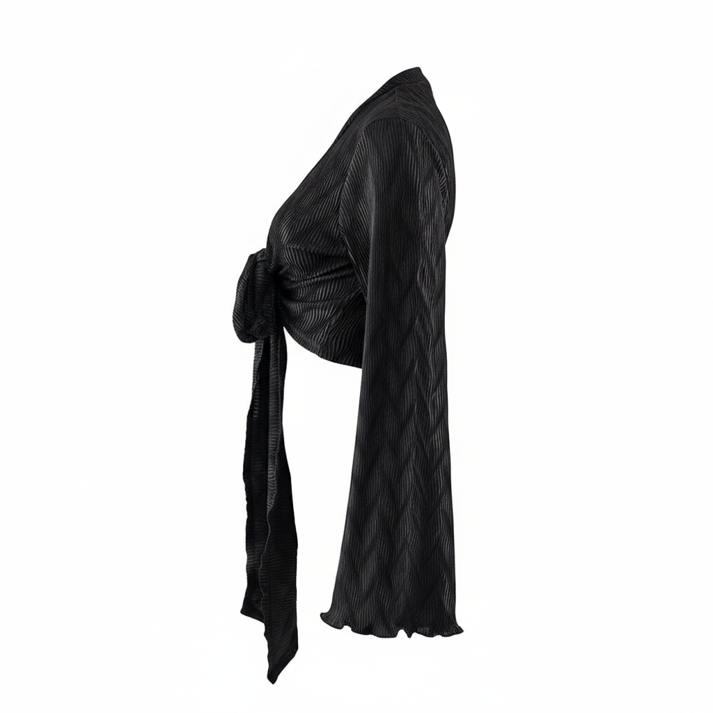 Este top de manga larga con escote profundo y amarre delantero combina frescura, actitud y libertad visual. Sus mangas amplias fluyen con cada movimiento, mientras que el nudo central enmarca la cintura de forma favorecedora. Ideal para looks que requieren un giro moderno y desenfadado sin perder estilo.