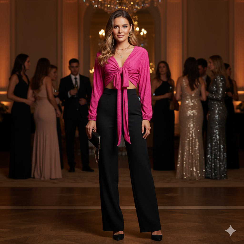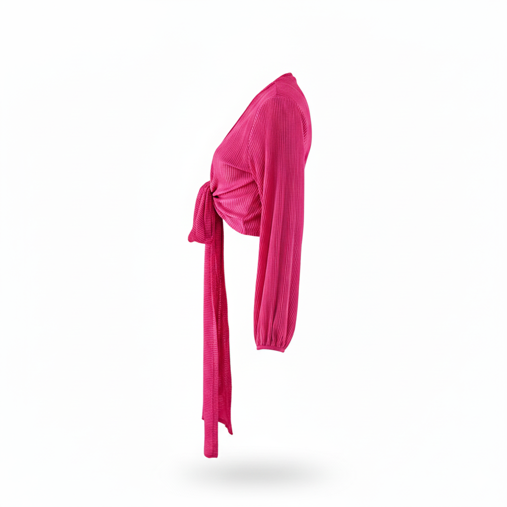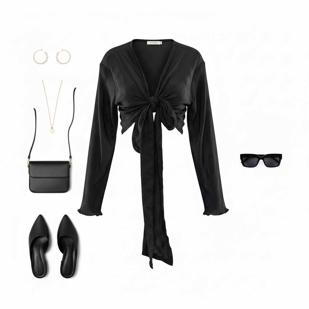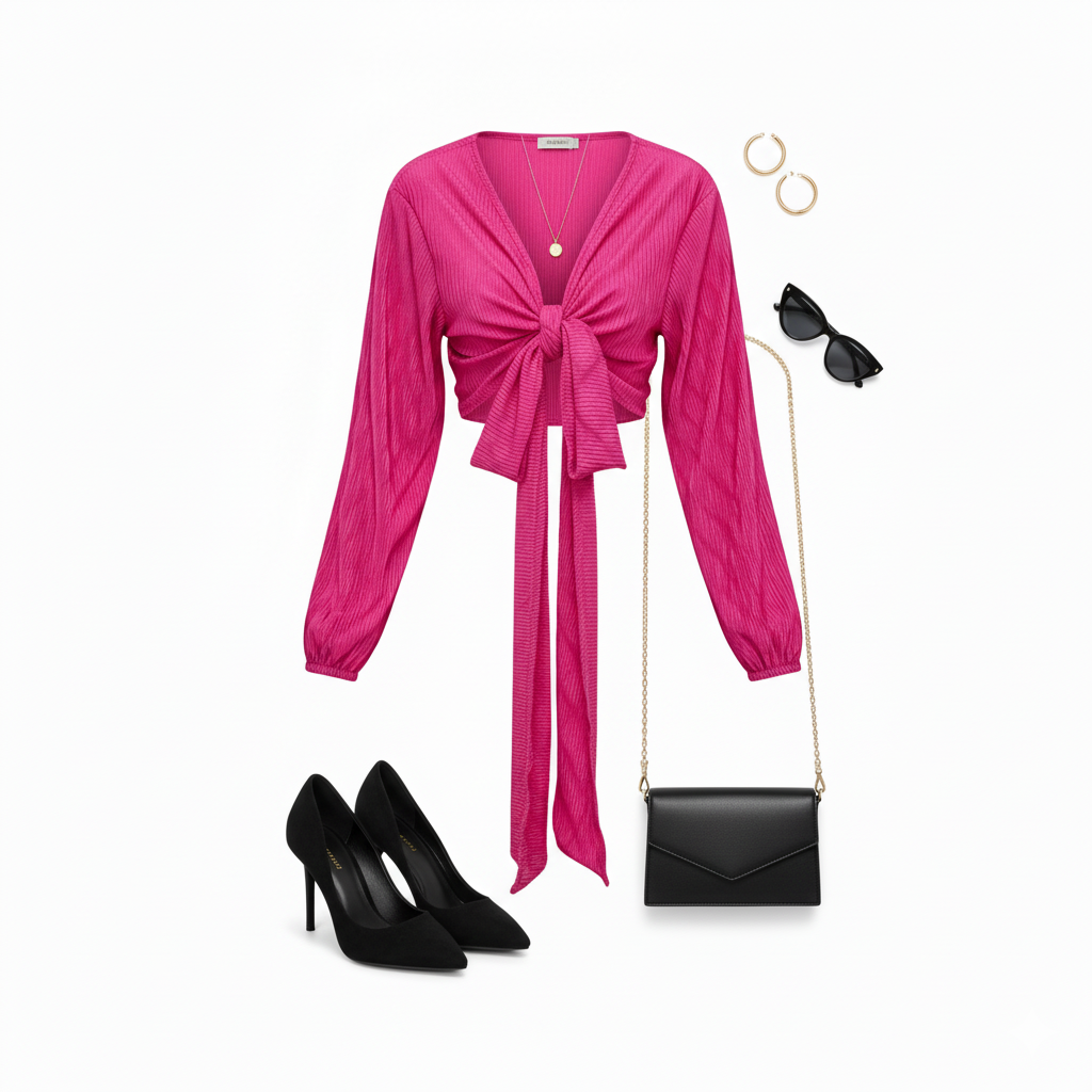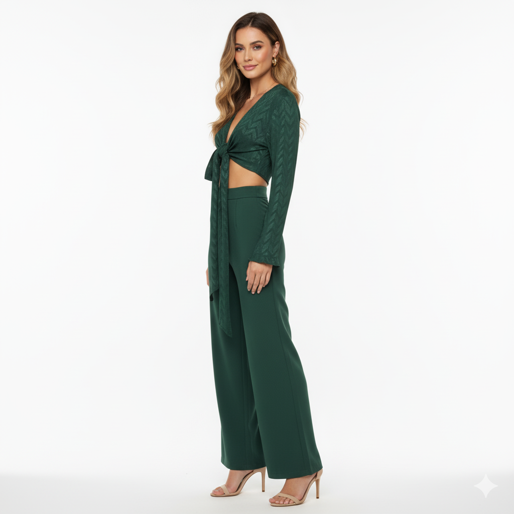 Este top de manga larga con escote profundo y amarre delantero combina frescura, actitud y libertad visual. Sus mangas amplias fluyen con cada movimiento, mientras que el nudo central enmarca la cintura de forma favorecedora. Ideal para looks que requieren un giro moderno y desenfadado sin perder estilo.
