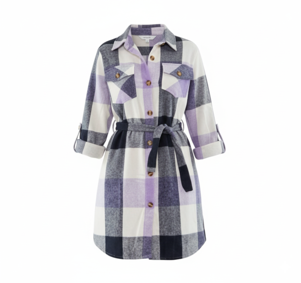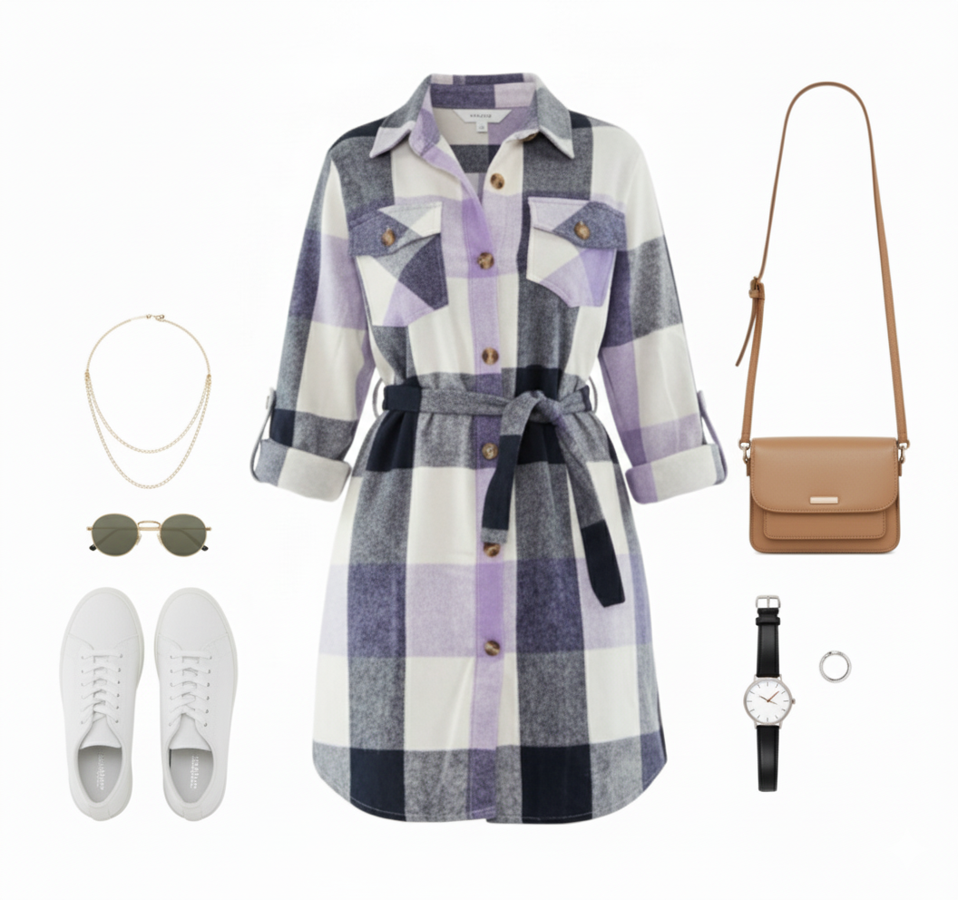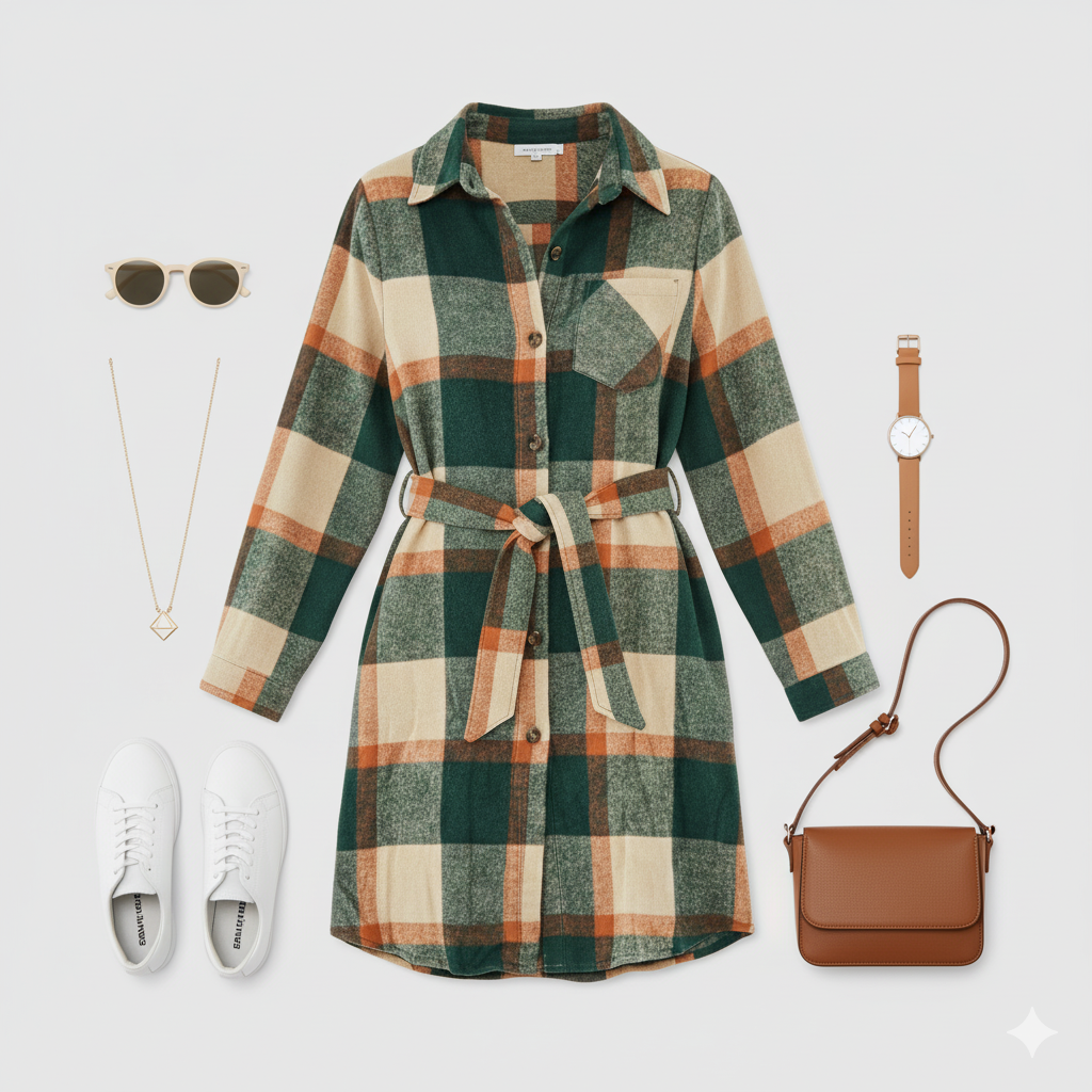 Este vestido corto de franela estilo camisero es una oda al confort con personalidad. Sus cuadros grandes y corte clásico evocan una estética natural y relajada, ideal para proyectar seguridad sin esfuerzo. El cuello tipo polo y el cinturón integrado marcan sutilmente la cintura, mientras que la textura suave lo convierte en una prenda acogedora perfecta para días frescos y momentos sin prisas.