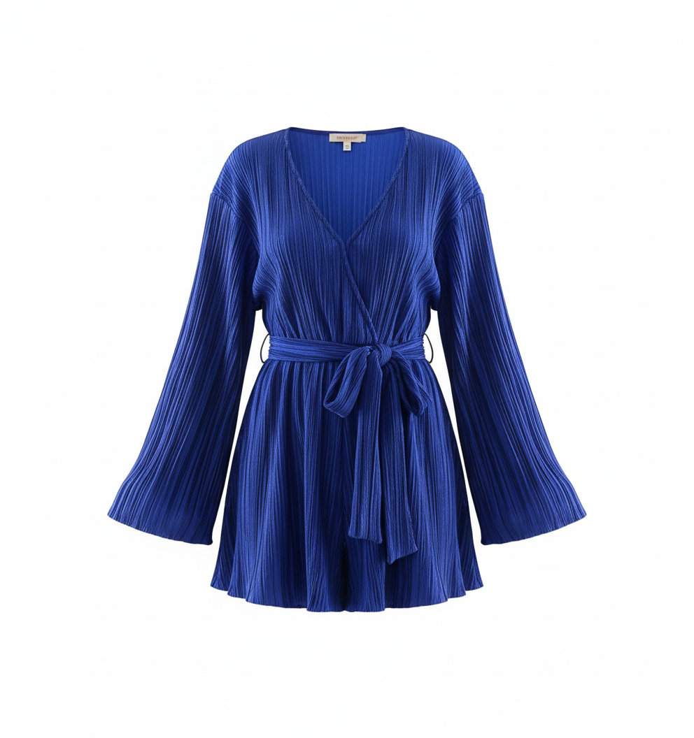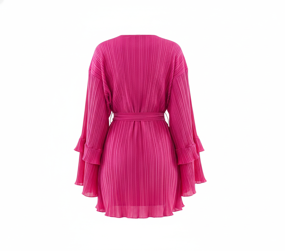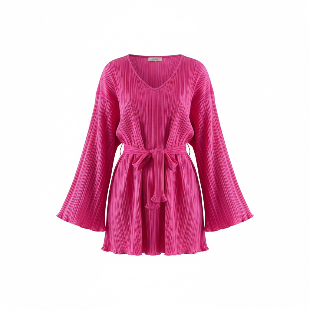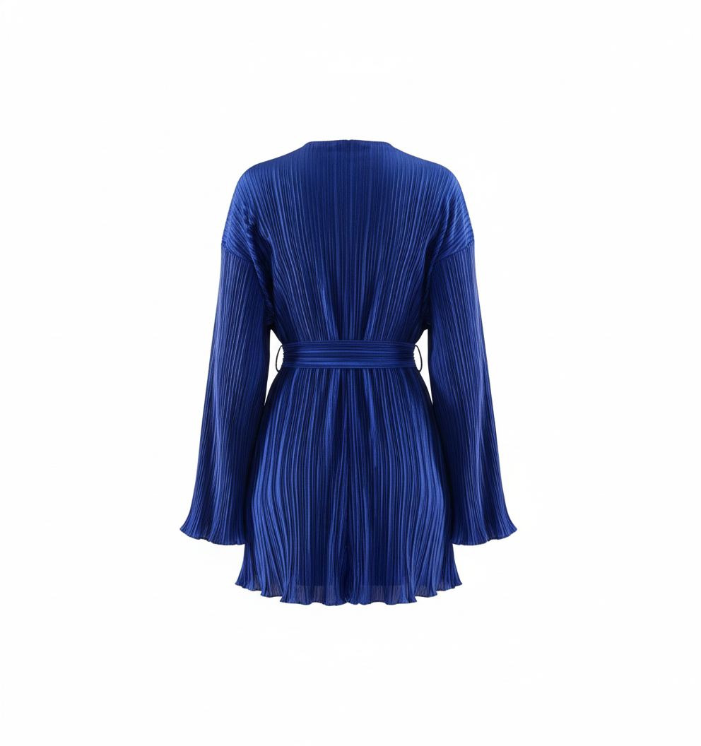 Este vestido corto con escote en V, mangas amplias y cinturón al frente redefine lo casual chic con un toque relajado y femenino. Su textura plisada y corte clásico le dan movimiento y ligereza, ideal para proyectar frescura y estilo sin esfuerzo.