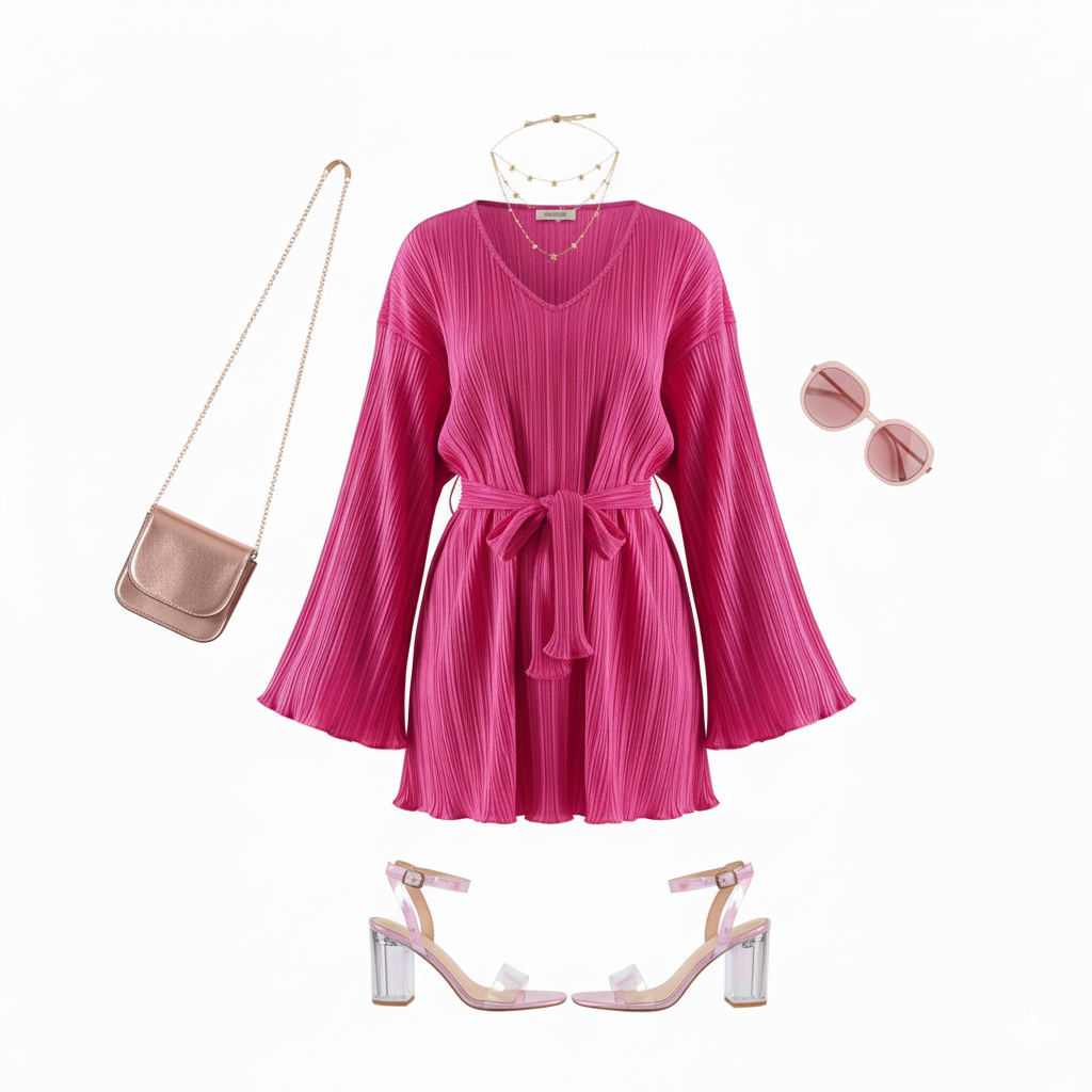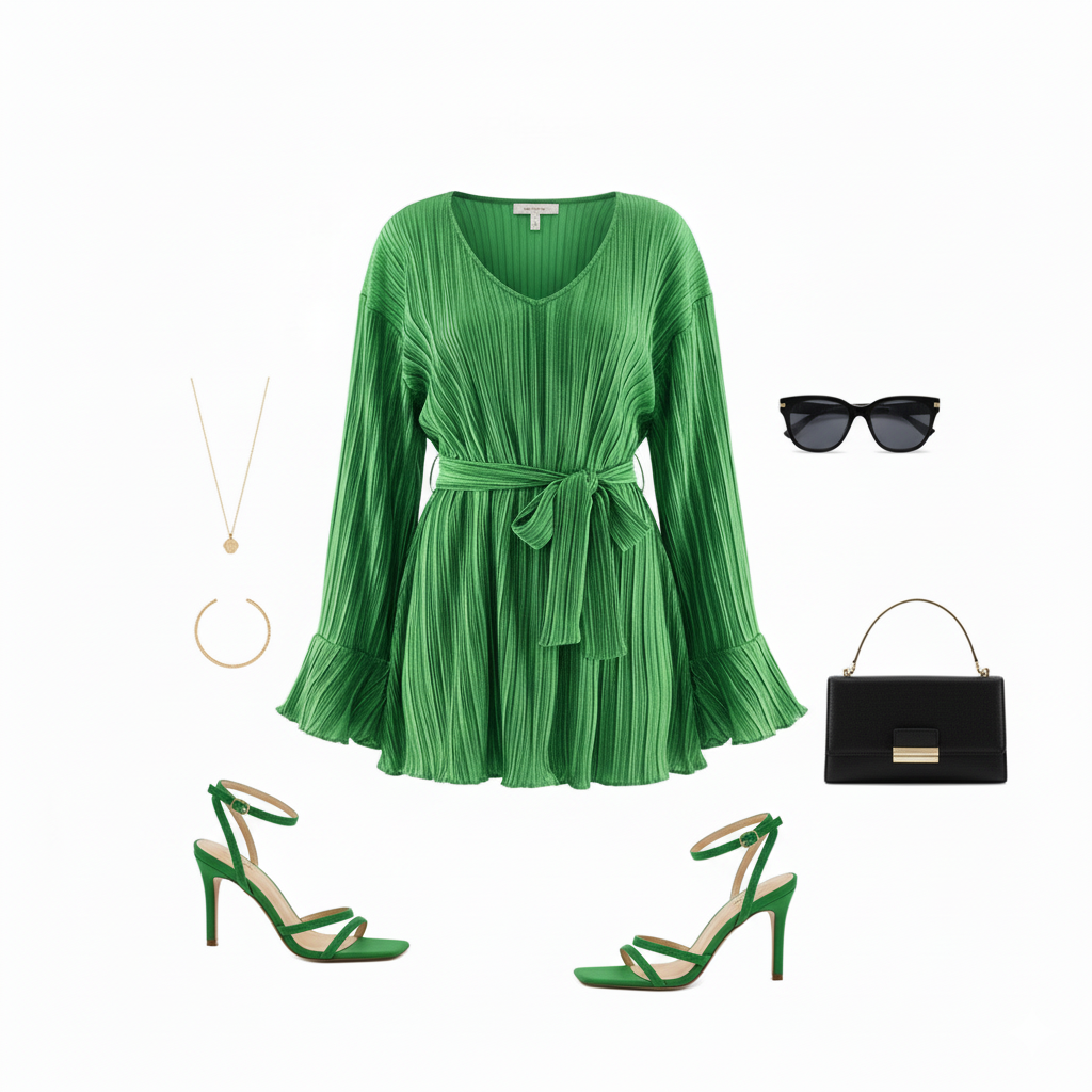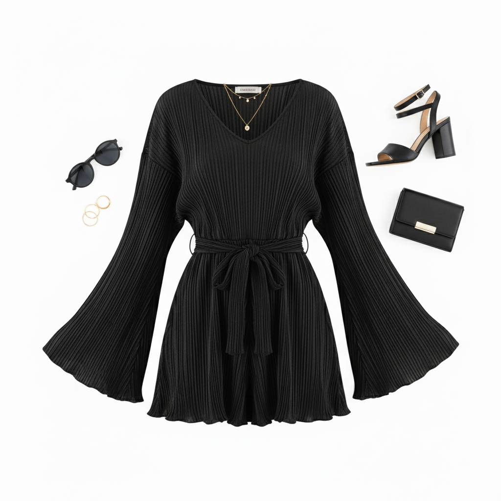 Este vestido corto con escote en V, mangas amplias y cinturón al frente redefine lo casual chic con un toque relajado y femenino. Su textura plisada y corte clásico le dan movimiento y ligereza, ideal para proyectar frescura y estilo sin esfuerzo.