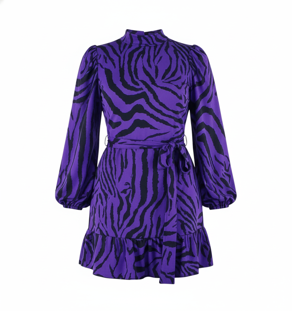 Este vestido corto de manga larga con cuello alto y estampado animal print fusiona el drama visual con un aire sofisticado. Las mangas farol y el escote cuadrado agregan una estructura estilosa, mientras el corte entallado al frente define la cintura. Ideal para quienes buscan destacar con un estilo audaz pero refinado.