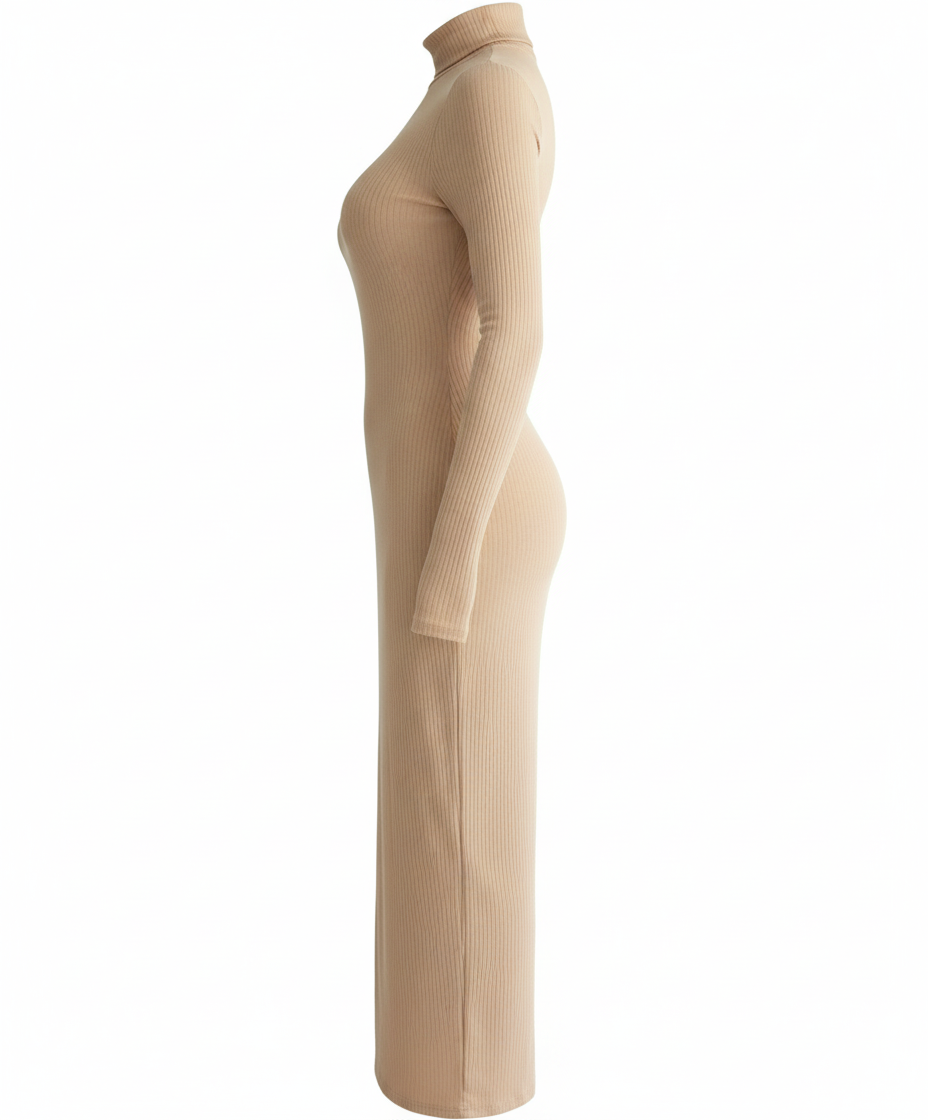 Este vestido largo de manga larga con cuello de tortuga y corte Chanel redefine la sofisticación con una estética pulida y sobria. Su diseño slim abraza la figura sin esfuerzo, proyectando autoridad con sutileza y una elegancia que no necesita adornos. Ideal para contextos donde la discreción refinada es sinónimo de poder.