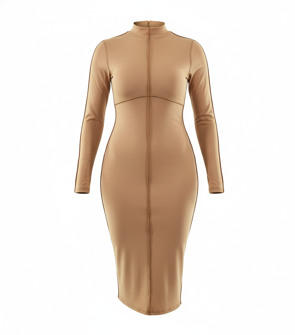 Este vestido largo de manga larga y cuello de tortuga redefine el minimalismo sofisticado con su corte Chanel. Las costuras visibles y su caída por debajo de la rodilla realzan una figura pulida y segura. Es una prenda que combina sobriedad con presencia, ideal para quienes desean vestirse con intención, sin exagerar pero dejando huella.
